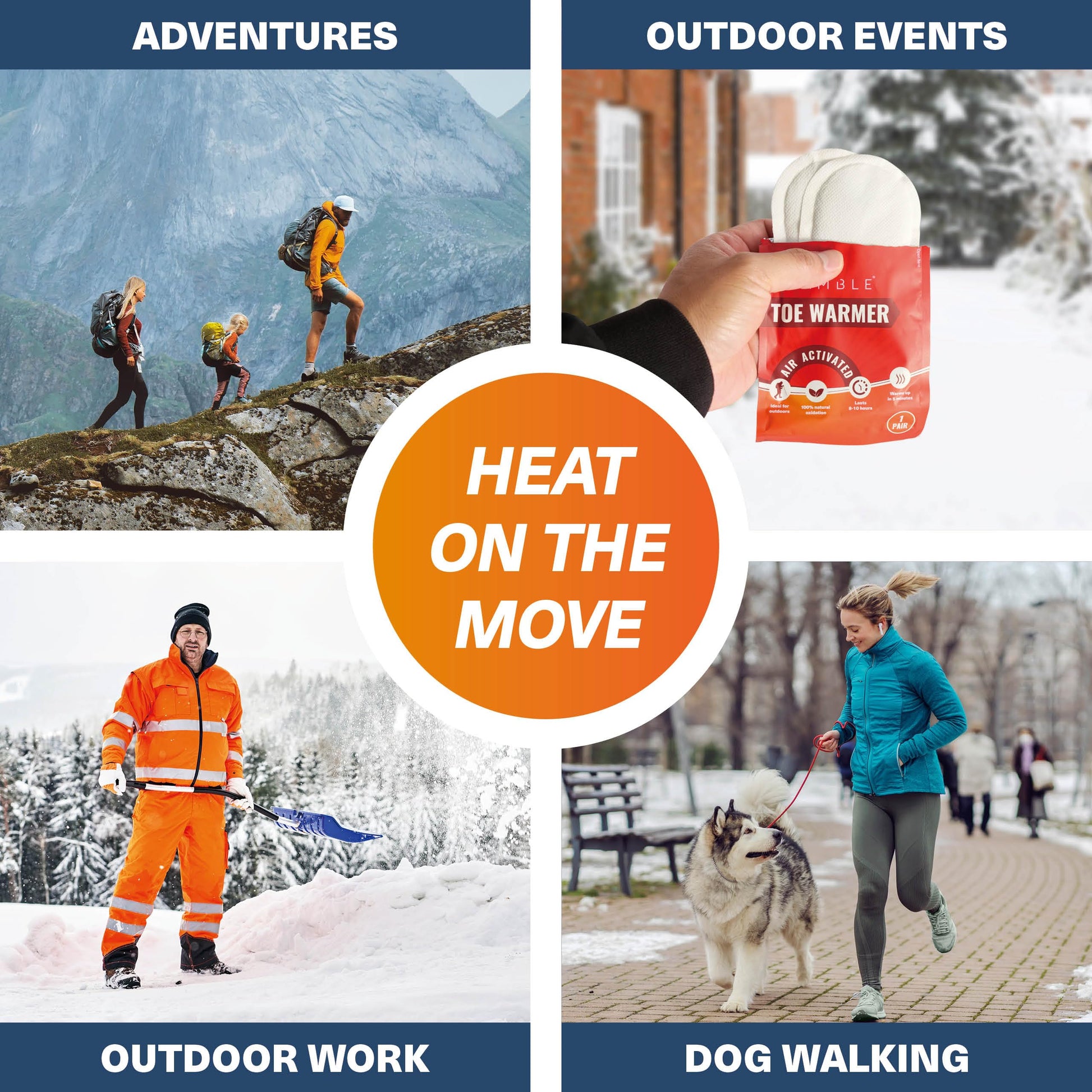• 80 ADHESIVE TOE WARMERS: Includes 40 pairs of air-activated toe warmers for feet, providing up to 10 hours of continuous warmth. These adhesive foot warmers are essential for outdoor activities in cold weather, ensuring your feet stay warm all day.