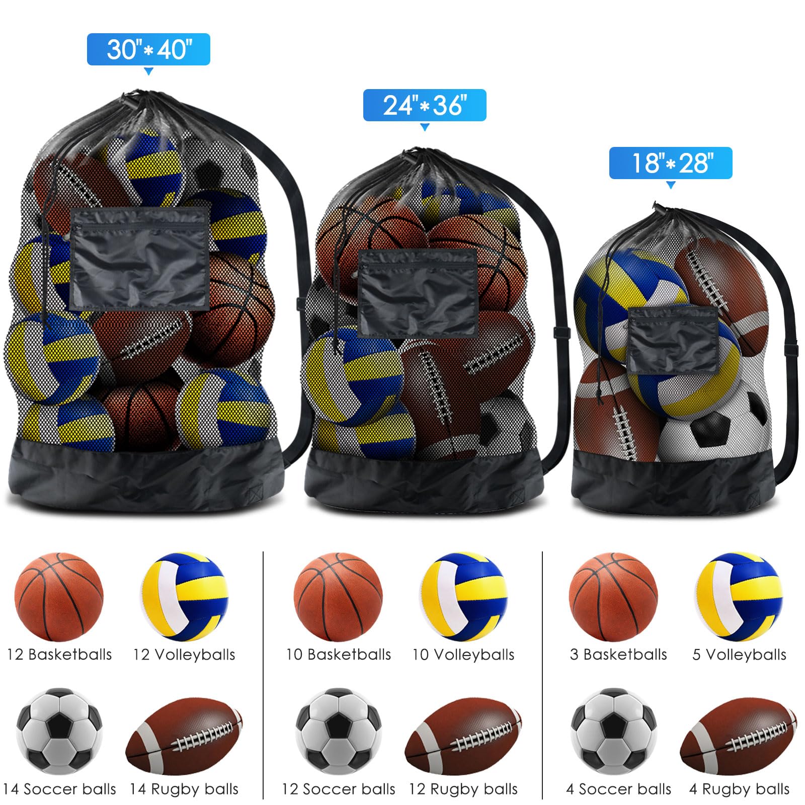 • LARGE HOLDING CAPACITY: Measures 18" x 28" Can hold 2-3 basketball, 3-4 soccer balls, 3-4 rugby balls, (Warning: Please note that the sizes of different types of balls vary. The number of balls this bag can hold will be directly influenced by the size of your balls. Please ensure that your balls match the bag's dimensions before purchase. The illustrations are for reference only and do not represent the actual capacity.)