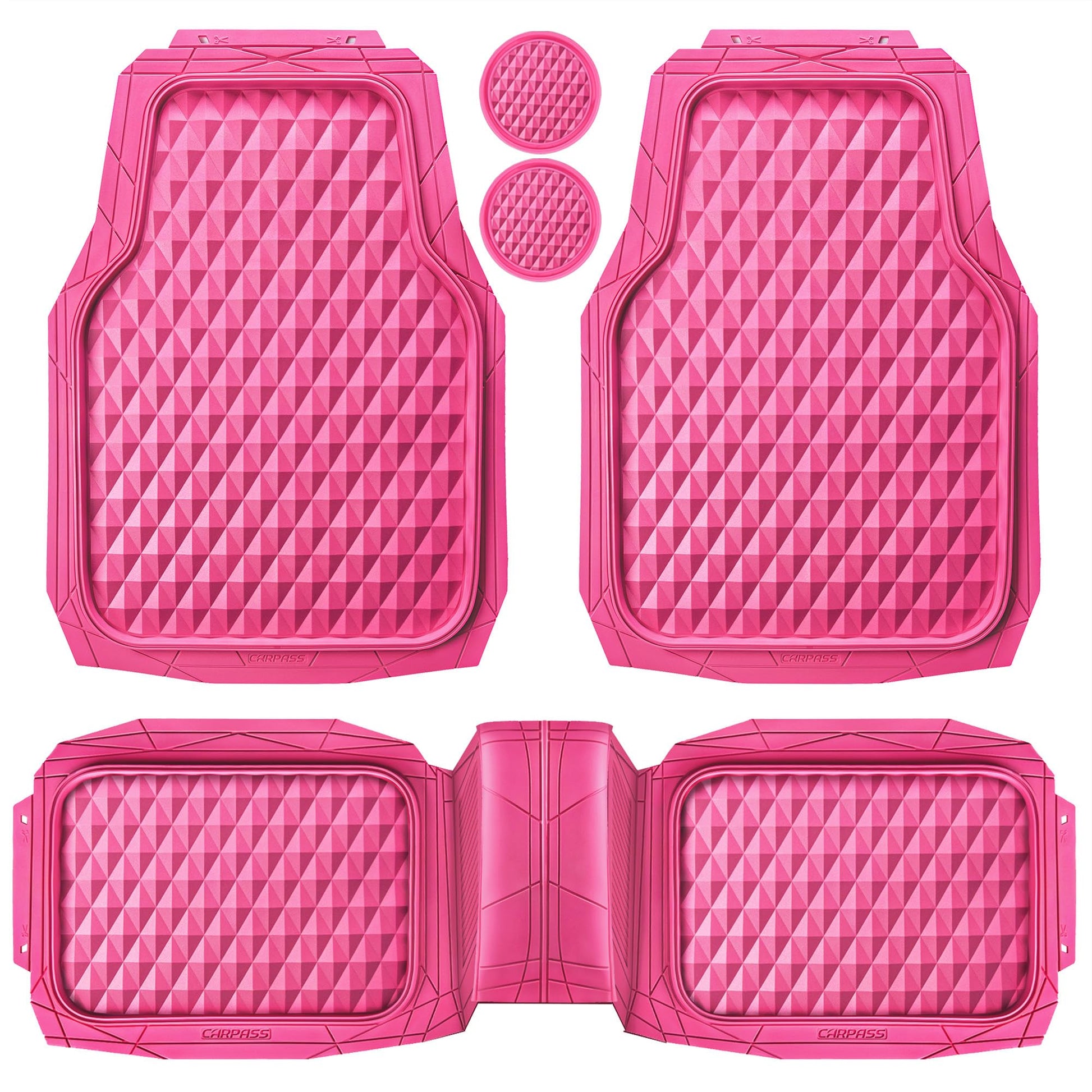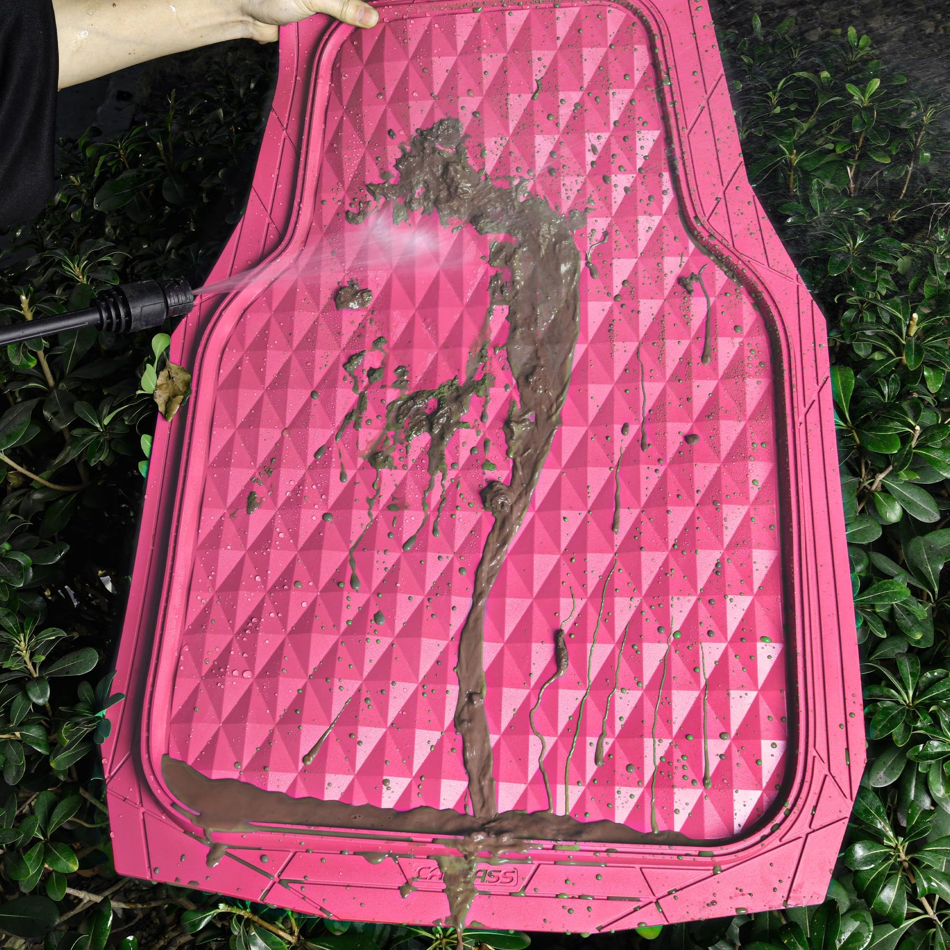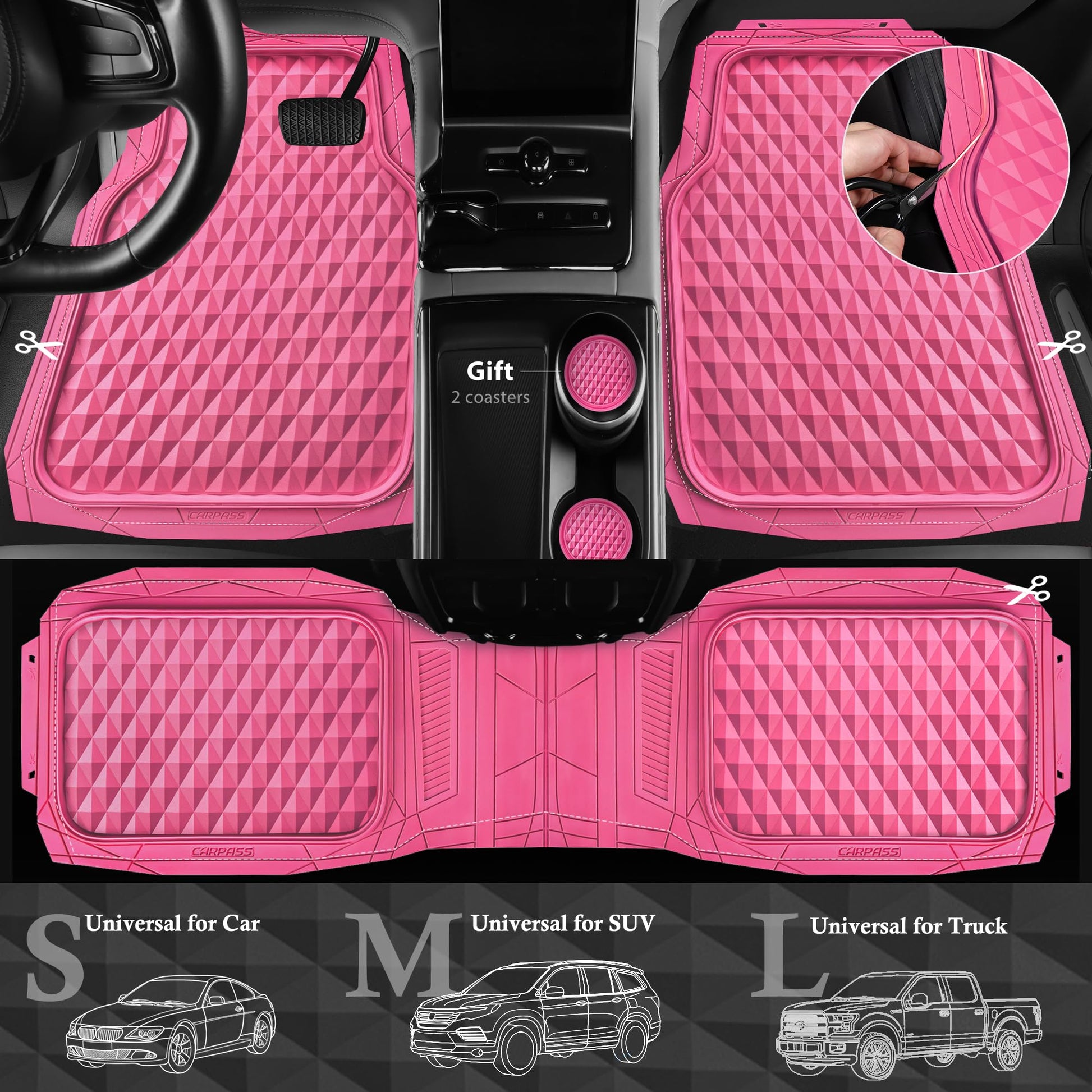 CAR PASS Heavy Duty Rubber Pink Car Floor Mats, Deep Dish All-Weather Full Set Durable Anti-Slip 3D Rhombus Waterproof Trim to Fit Liner Universal Fit Automotive,Sedan,SUV,Truck, 3 Pcs Hot Pink
