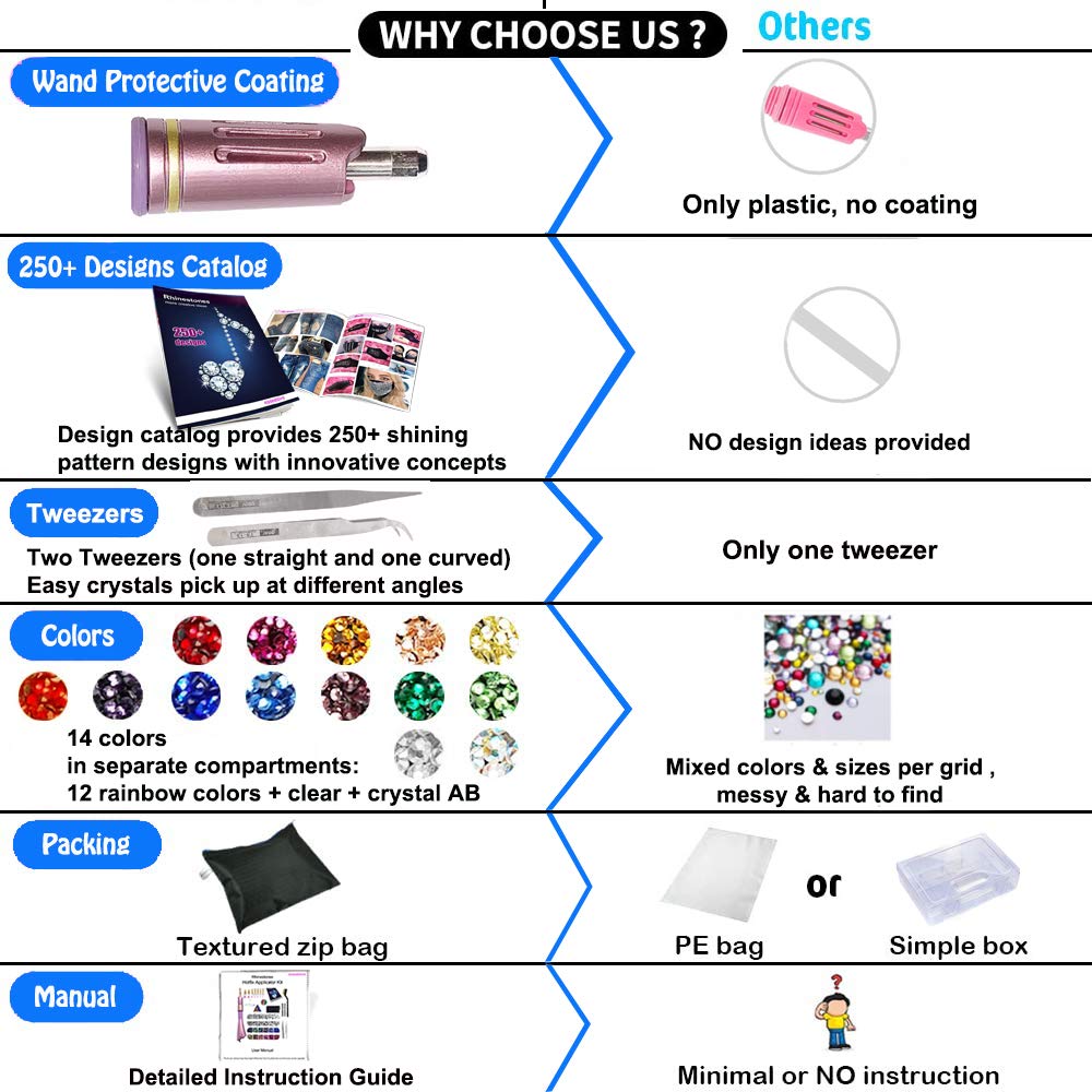 • Easy to Use with Clear Instruction - The Rhinestone Pen Applicator heat setter tool comes with a DIY step by step manual instruction. Tweezers and the wax jewel picker are specially for picking up rhinestones. When the tips are sticky with melted glue, please use the wire brush to clean the tips' edges.Rhinestones for crafts Ideal for making unique birthday, Christmas, Thanksgiving for families, for kids, friends, lover, blingers for girls.