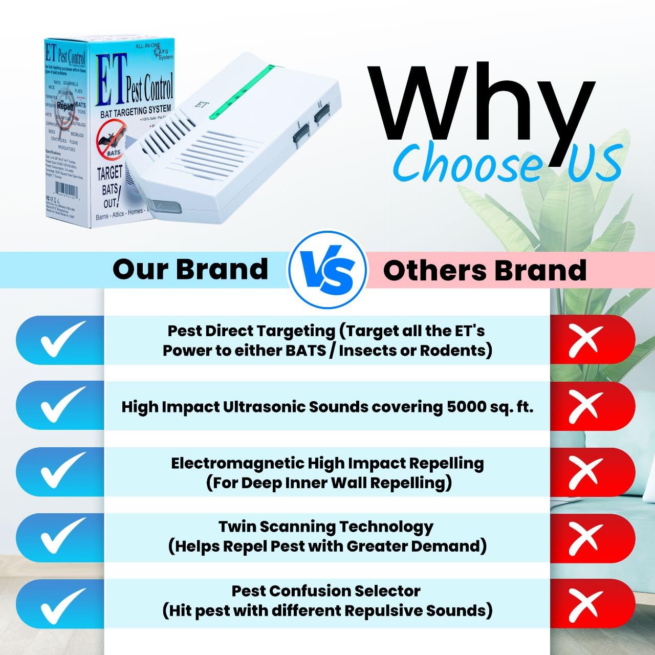 Details: Brand:DNR Tech. Color:white Features: Pest Direct Targeting (Target all the ET's Power to either BATS / Insects or Rodents) High Impact Ultrasonic Sounds covering 5000 sq. ft. Electromagnetic High Impact Repelling (For Deep Inner Wall Repelling) Twin Scanning Technology (Helps Repel Pest with Greater Demand) Pest Confusion Selector (Hit pest with different Repulsive Sounds) Publisher:DnR Technologies LLC. Warranty:ET Pest Control is covered with a one year warranty that covers defective parts. If something has gone wrong with the ET Pest Control unit within the year of purchase, you can return your product and we here at DNR Technologies LLC. will fix the problem or either replace it with a new one. All return shipping fees must be paid by the customer. If the ET Pest Control unit has Massive exterior or internal damage the 1 Year Warranty Will Not Apply. A D&R Technologies LLC. Technician will decide if Massive exterior or internal damage has occurred upon a return. Details:ET Pest Control gives you Direct Targeting Control. High Range Targets Insects/BATS. For Insects customers have reported success in repelling ants, beetles, bees, bedbugs, centipedes, cockroaches, crickets, earwigs, fleas, flies, mosquitoes, moths, scorpions, spiders, termites, water bugs, silverfish, ticks, etc. Low Range Targets rodents such as mice, rats, squirrels, etc. (if you do not see your pest problem, e-mail us so we could help you find out if the ET Pest Control can do the job) ET Pest Control Powerful Repelling Techniques: 1) High Impact Ultrasonic Sounds: Coverage of 5000 sq. ft. in open area this technology drives most pest problem crazy driving them out of your home or business. An example of HIUS would be like your ear right next to a train horn or fire engine siren. 2) Twin Scanning Technology: Instead of your common one speaker pest repeller the ET Pest Control was build with TST, this is Two High Powered Speakers that are off set just enough to give you greater repelling coverage. 3) Electromagnetic High Impact Repelling: The ET Electromagnetic Repelling utilizes the wiring within your walls sending signals tuned towards irritating pest to the max! This type of repelling is the first line of defense when pests try and enter your home. As this technology is a secondary repellent there is nothing that you need to set as you simply plug-in the ET and the wiring within your walls starts to repel. UPC:799331376730 EAN:0799331376730 Package Dimensions:6.9 x 3.7 x 2.3 inches
