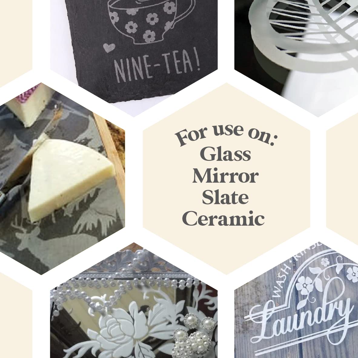 CREATE BEAUTIFUL DESIGNS - professional-grade etching product for a creamy smooth, opaque finish, perfect for creating PERMANENT designs on Glass, Mirrors, Ceramics, Porcelain, Marble & Slate