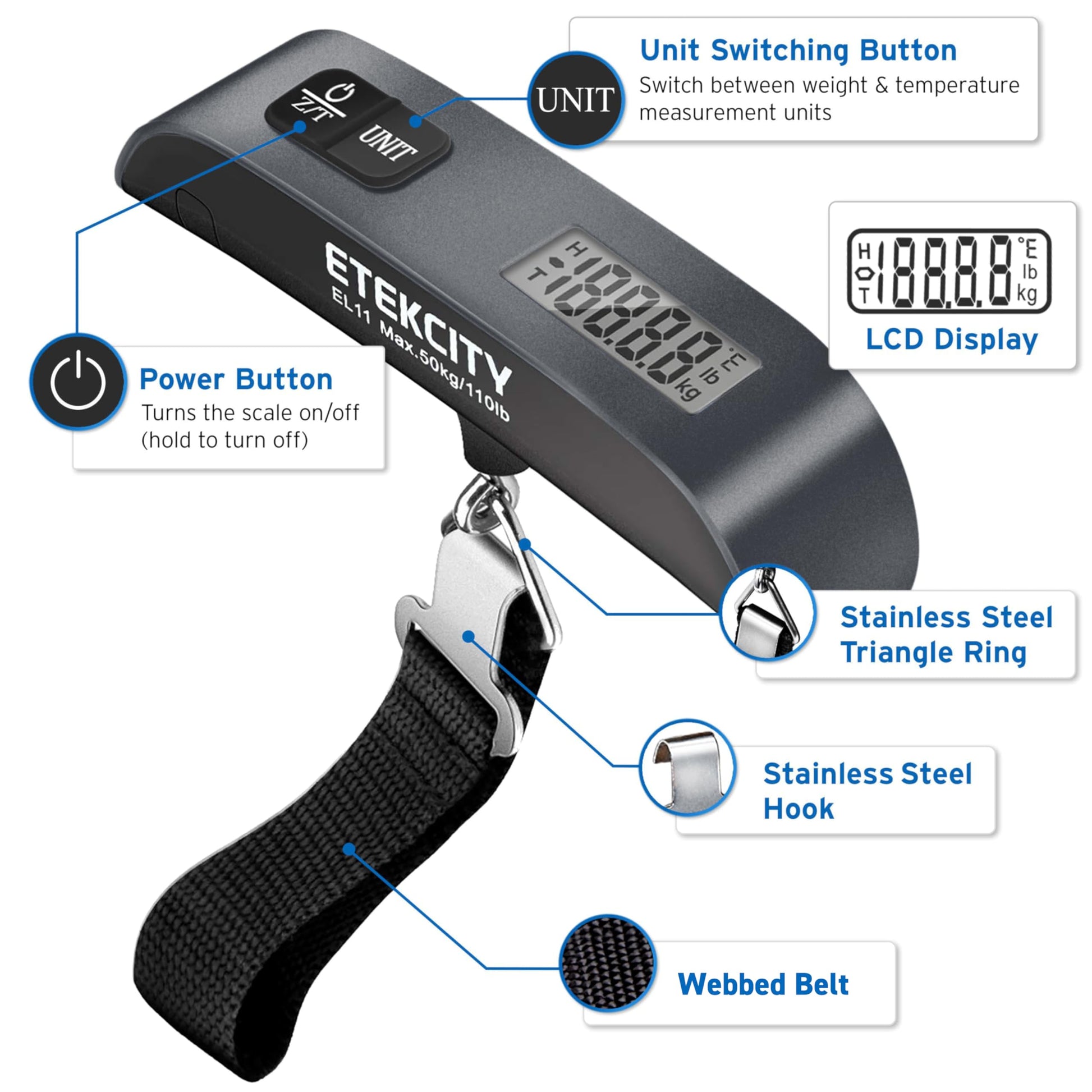 Details: Travel Smart, Avoid Overweight Fees The Etekcity Luggage Scale is your travel essentials, offering precise measurements up to 110lbs (50kg). Its compact design makes it easy to carry, and the simple one-button operation ensures you can check your luggage weight quickly and easily, preventing last-minute packing hassles. Travel with confidence and avoid surprise chargesโlightweight, reliable, and perfect for any journey.