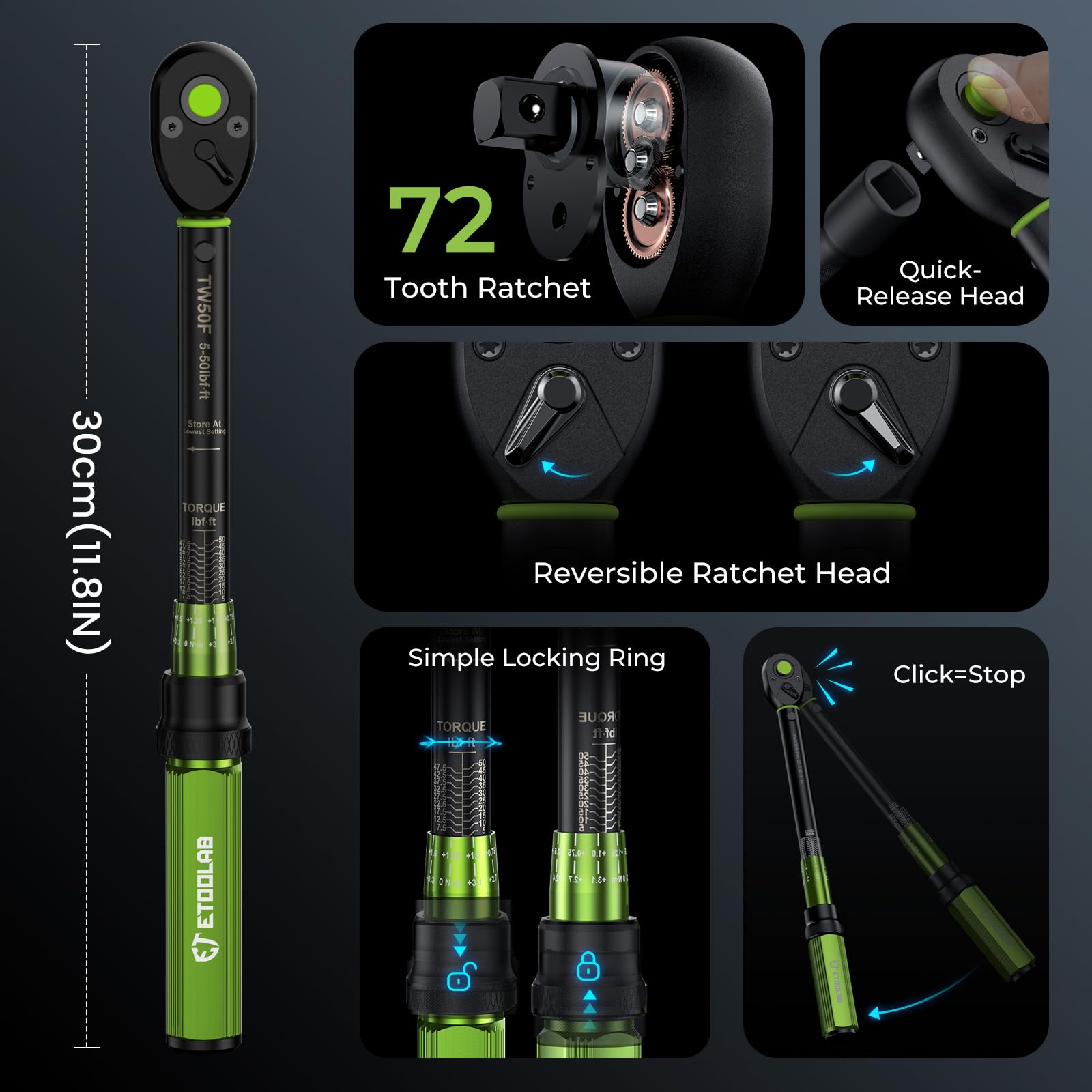 etoolab 3/8-Inch Drive Click Torque Wrench - 5-50Ft-Lb/5-69.4Nm, Dual-Direction Adjustable 72 Tooth Click Torque Wrench for Bike, Motorcycle and Car Repair
