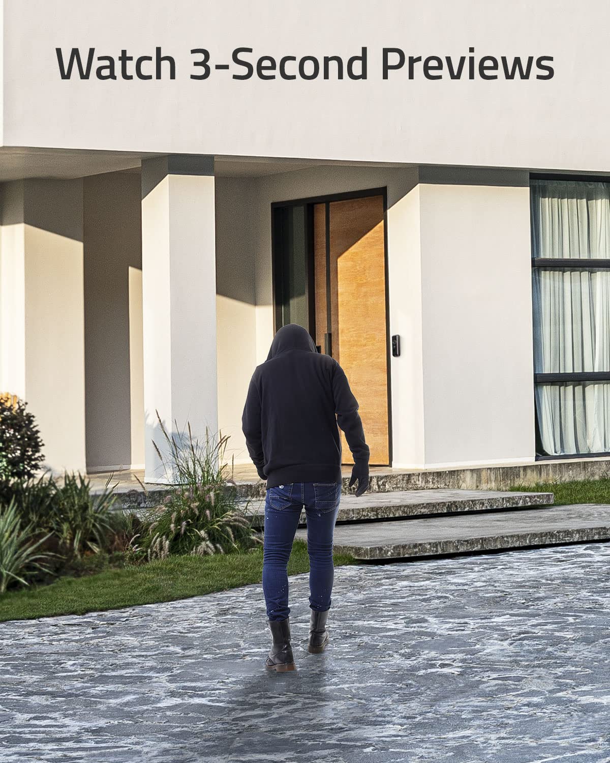 • 3-Second Preview Videos. See what triggered a recording, so you know how visitors approached your door and what they were doing.