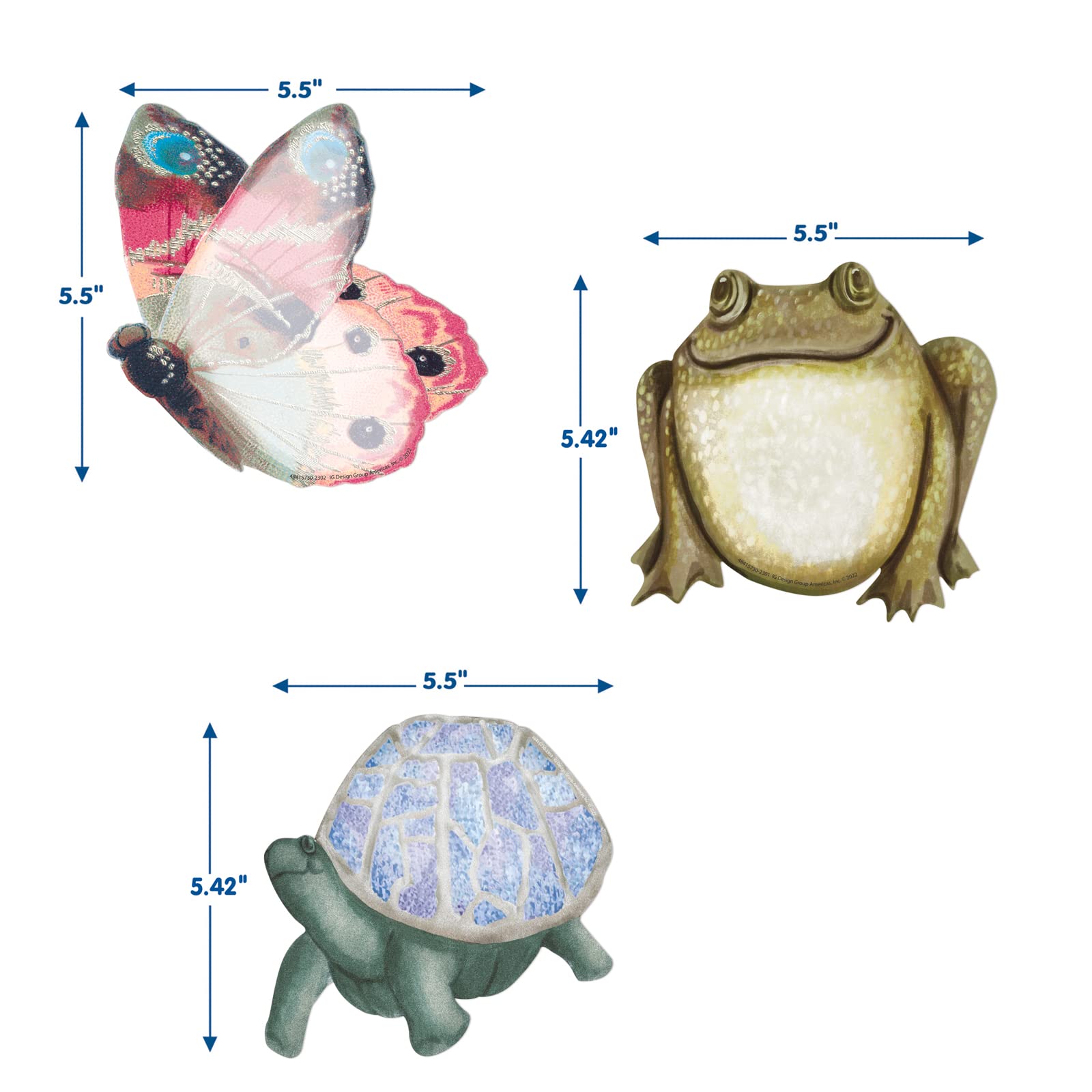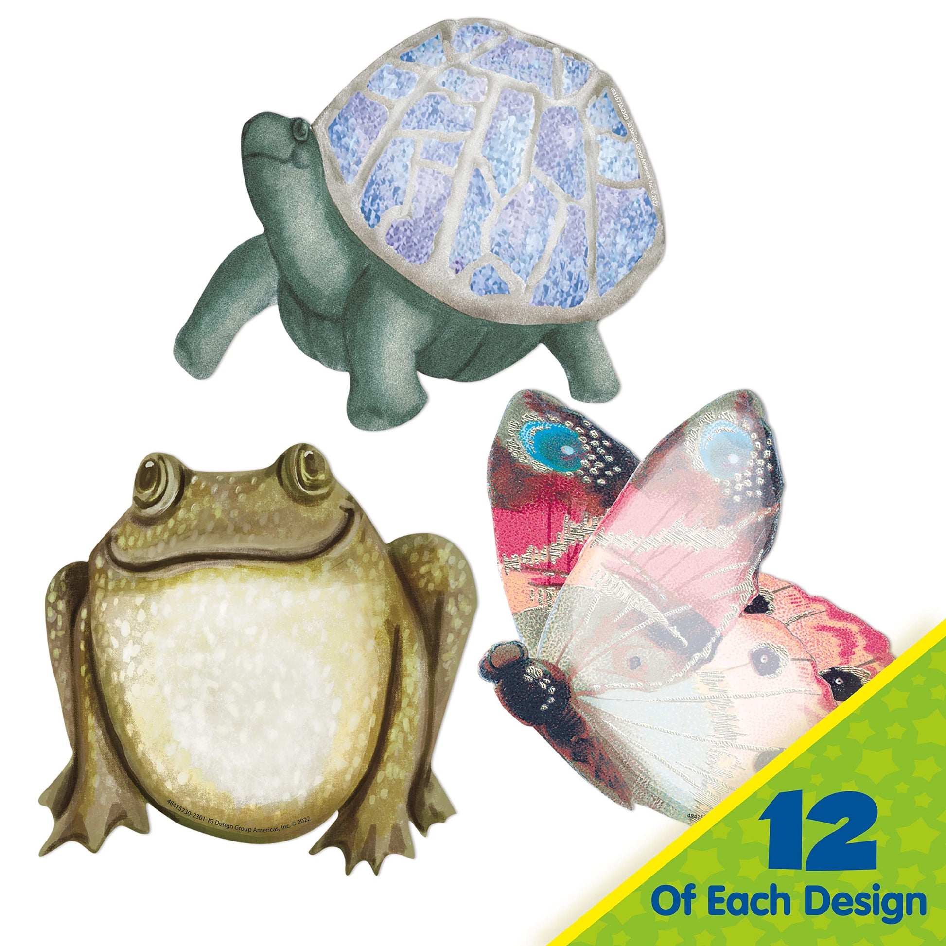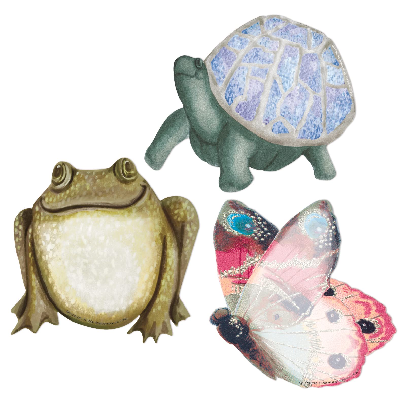 Comes with 36 decorative classroom cutouts (12 each of 3 designs: frog, butterfly, and turtle)