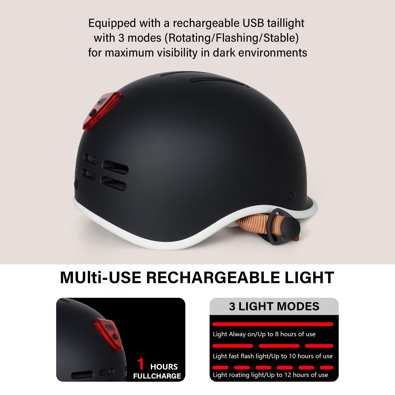 • 【USB Rechargeable Light】: Our Bicycle helmets included LED light provide the better possible protection and visibility for night riding.The rear lights have 3 modes: constant, flash, slow flash.You don’t need to remove the helmet to change the light.