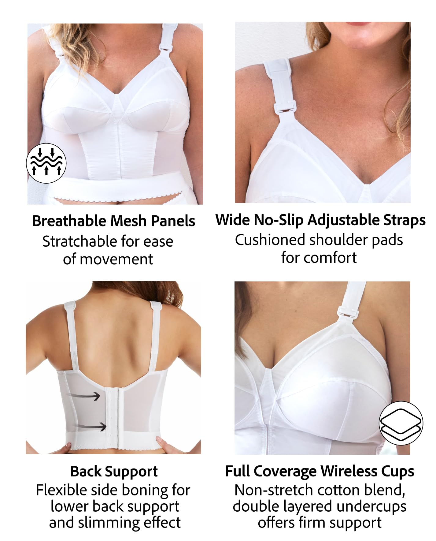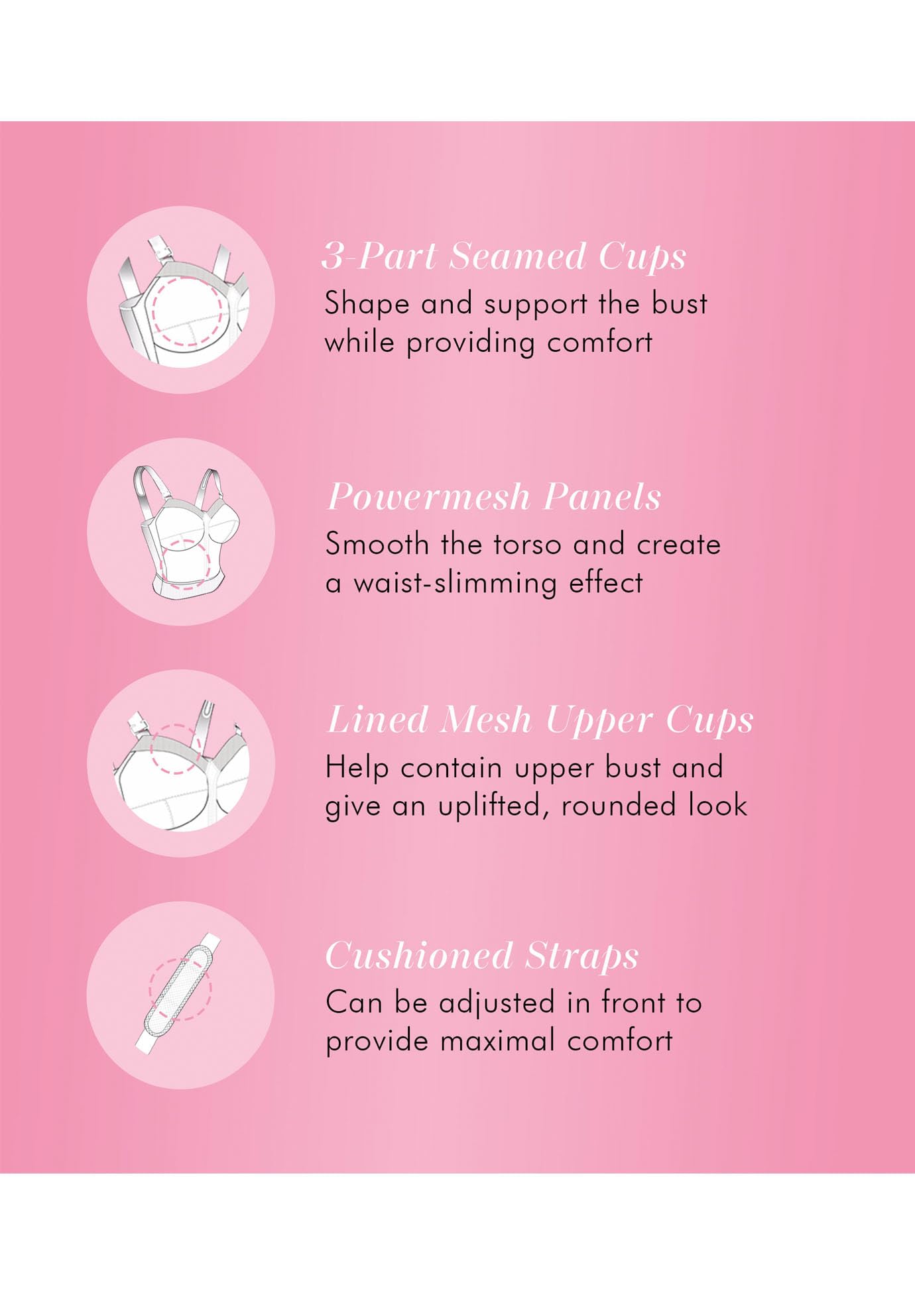 POSTURE SUPPORT. This women's full-figure longline is designed with supportive 3-part seamed cups and power mesh waist-slimming panels to help support your back, smooth your waist and correct your posture.