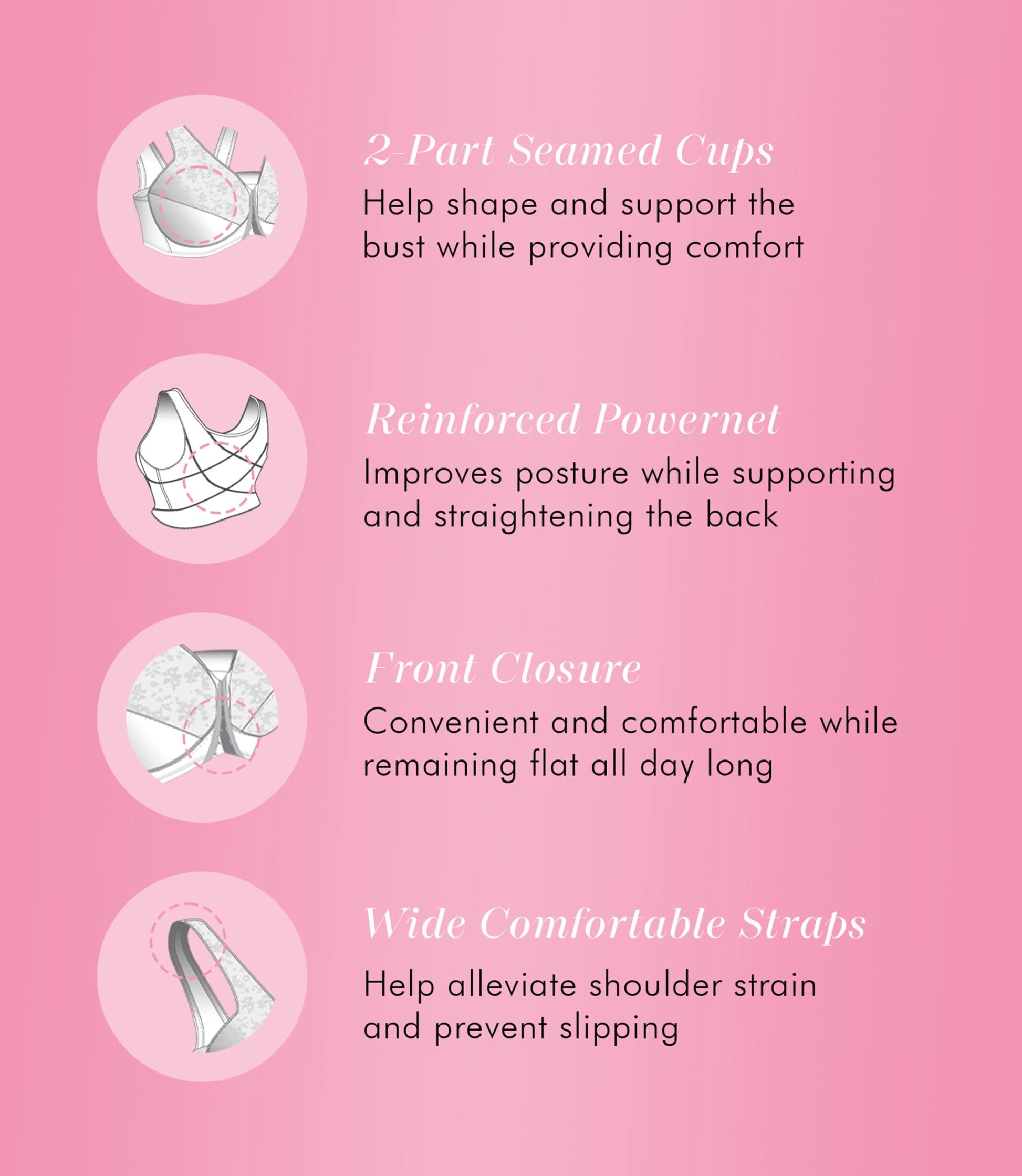 FRONT CLOSE. The days of blindly reaching behind you to clasp your bra are over. Our lifting and supportive posture bra has a convenient and comfortable brush-backed front-closure to make dressing for the day a breeze.