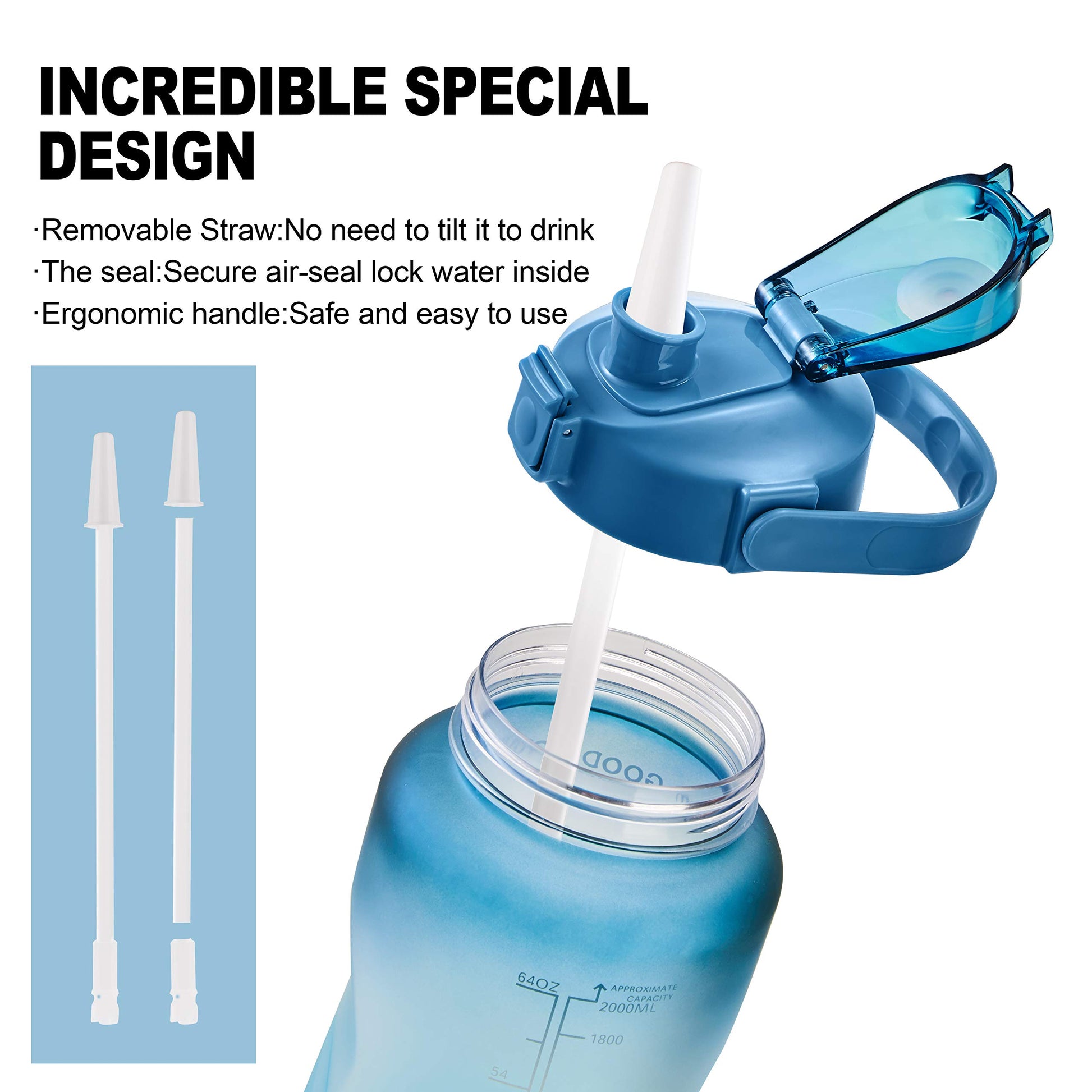 • FUNCTION DESIGN: Opening the lock has a silicone nozzle with a straw inside to prevent turbulent water flow. Wide-mouth opening is easy to fill with ice cubes and fruits, also for efficient cleaning. The Water Bottle with straw fits in a car cup holder