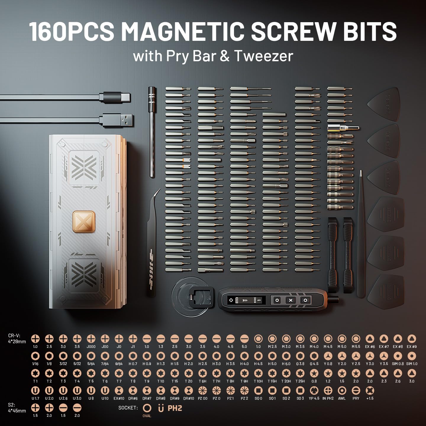 • 【Perfect for Families and DIY Enthusiasts】With 160 precision bits in 26 types (PH1, PH2; H3, H4, H5, H6; SL4, SL5; TR20, TR25, and more), this electric screwdriver kit meets every household need, covering all possible screw sizes and types. Thus, it's the perfect gift for families or DIY enthusiasts with its innovative features and stylish futuristic aesthetics.