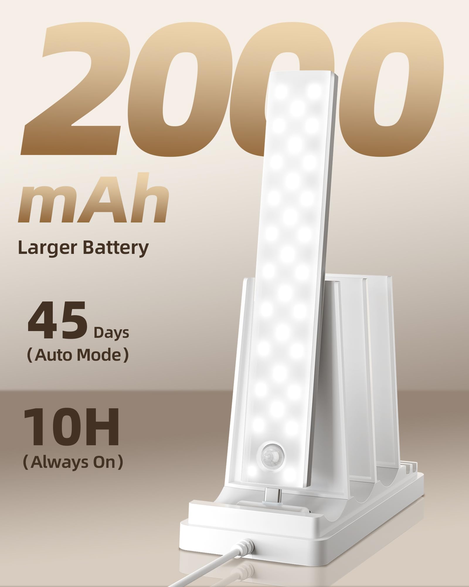 • Long Battery Life & Smart Charging: This 2000mAh rechargeable under cabinet lighting lasts 20-45 days in [Auto Mode] and 11 hours on MAX brightness in [Always-On Mode]. The 3-slot USB-C charging dock keeps multiple lights powered without clutter. Plus, it can charge other devices like phones and headphones, adding extra convenience.