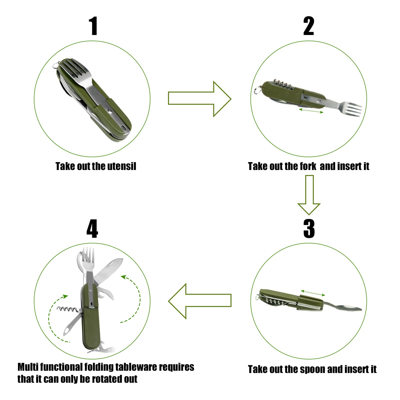 • Washable and Easy to Carry - These lightweight, sturdy, and rust-free utensils are perfect for any situation. Use them as your go-to survival fork and spoon set, green Swiss army knife, folding spoon and fork set, or truck cutlery.