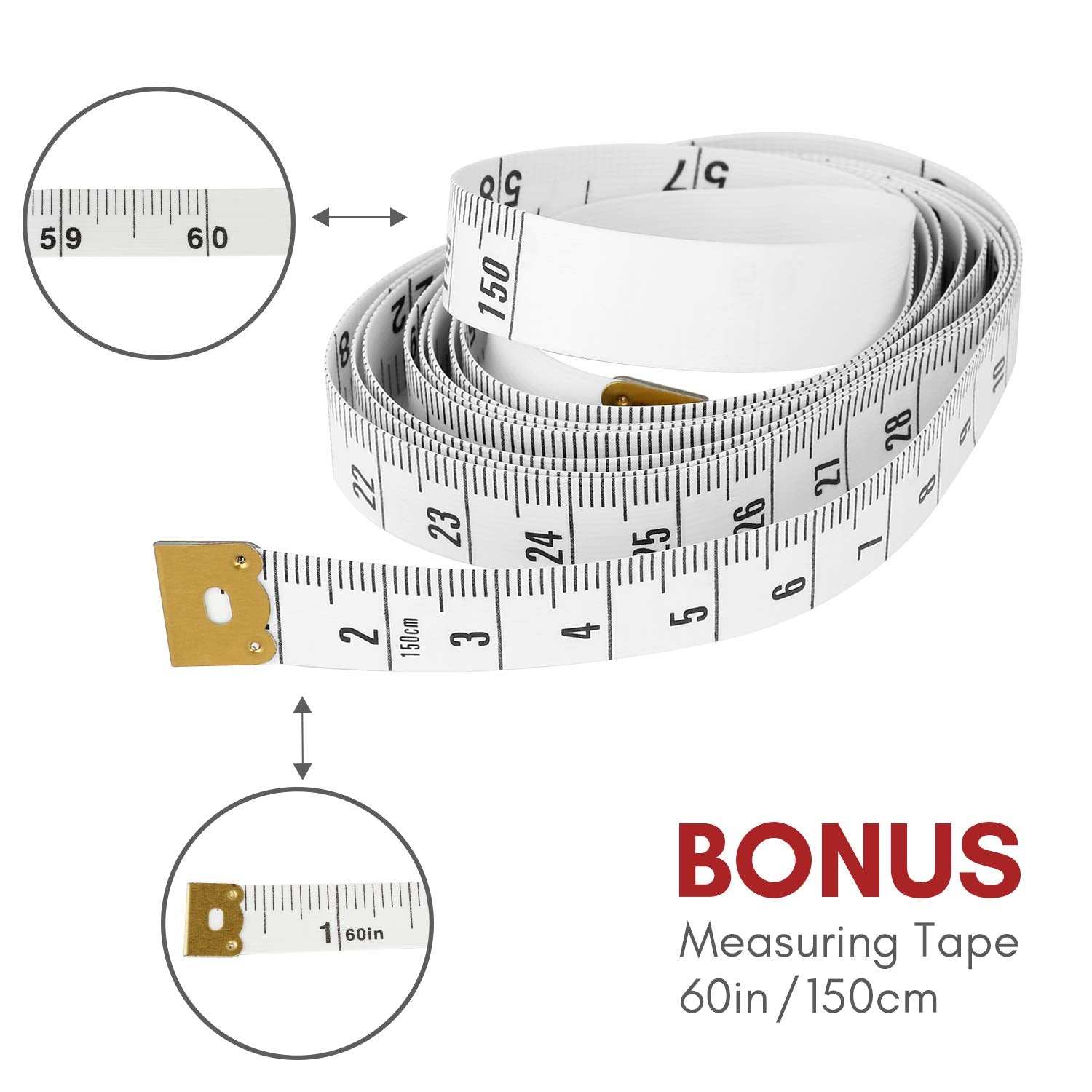 • BONUS MEASURING TAPE: Flexible and portable measuring tape, made from soft plastic material, white color, suitable for measuring curved or flat surfaces, dual sided to show inches and centimeters, measuring range is 60 inches / 150cm.