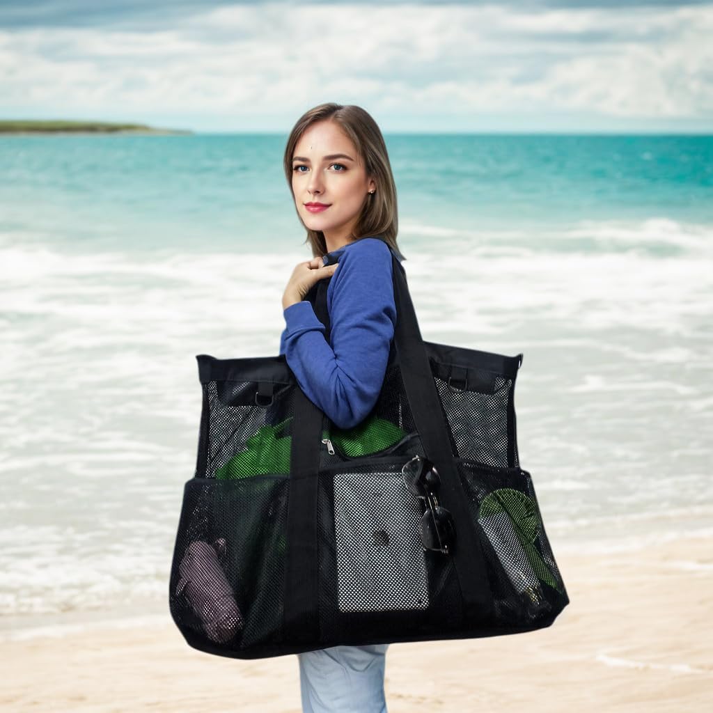 Fammart Extra Large Mesh Beach Bag for Family, Pool Travel Tote Bag with Zipper Closure, 10 Pockets, Sandproof Bottom