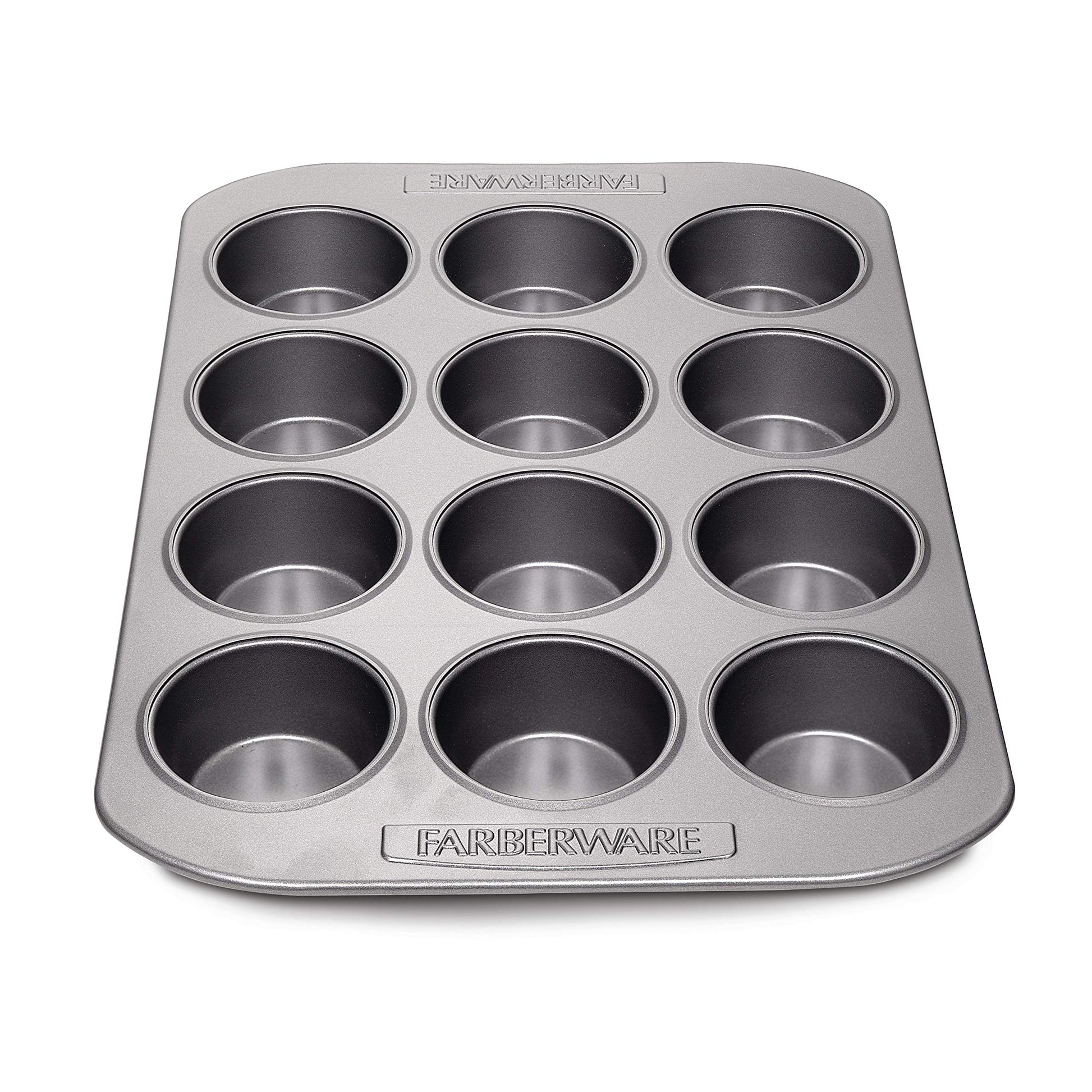 Details: Say goodbye to paper baking cups and other clutter when baking muffins or cupcakes with the Farberware Bakeware Nonstick 12-Cup Muffin Pan.Superior nonstick inside and out of this combination muffin pan and cupcake pan delivers great food release. For more than a century, Farberware has provided reliability, value, and performance to generations of home bakers, and upholds that tradition with every piece of sturdy and dependable bakeware. Featuring heavy-duty construction, this durable nonstick cupcake pan and muffin pan reliably resists warping and heats evenly to brown cupcakes and muffins beautifully and help reduce hot spots that can burn baked goods. And cleanup is quick, even after baking individual servings of ham and cheese quiche. Oven safe to 450°F, this muffin pan makes an ideal addition to the cake pans, bakeware sets and other baking pans in the full Farberware Bakeware collection. Mouthwatering muffins, delectable cupcakes and more are easy to bake - and easy to remove - from the Farberware Bakeware Nonstick 12-Cup Muffin Pan.