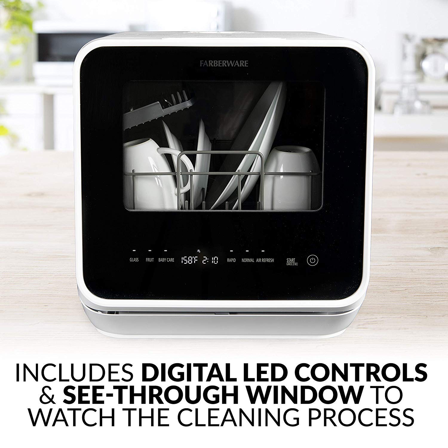 Details: The Farberware Portable Countertop Dishwasher works for small kitchens, apartments, RVs, and even on camping trips. With its 5-liter built-in water tank, you no longer need to worry about hooking up to a water source. Fill the tank, plug it in, and let the powerful 5-program system take care of the rest. Our portable dishwasher is not just limited to cleaning dishes. It also features a baby care function, ensuring your baby bottles are steam-cleaned and sterilized to perfection. The glass and fruit wash programs are designed to give your glassware a sparkling clean finish and gently wash your fruits and vegetables. The Farberware Portable Countertop Dishwasher can make an excellent addition to your home or on-the-go lifestyle, making dirty dishes a thing of the past.