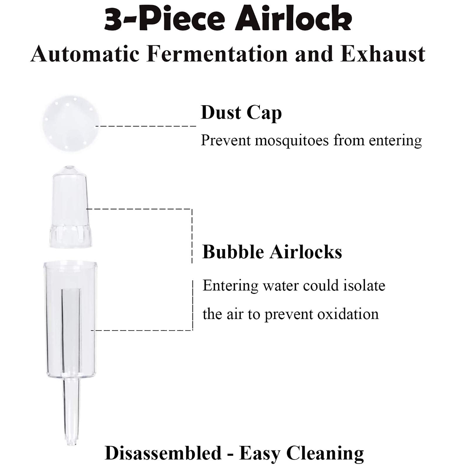 • Easy to Clean: The 3 piece airlock can be disassembled, and with a small brush completely cleaned. It can soak in bleach water to disinfect(Warning--DO NOT sterilizing the plastic airlocks with boiling water)