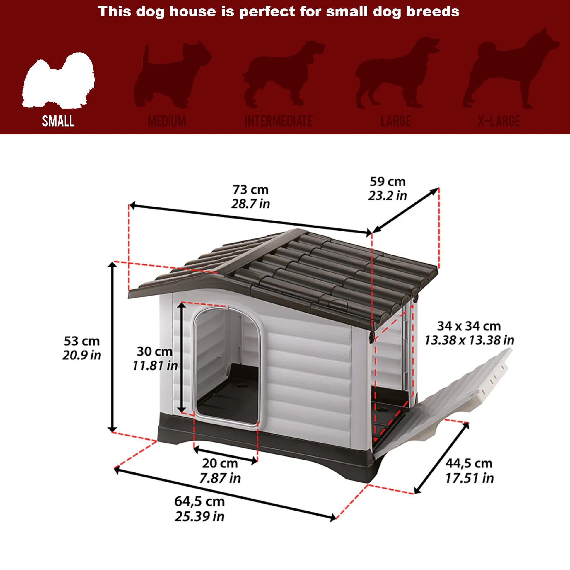• Durable Dog House ; Made with anti-shock robust plastic that is waterproof and UV rays resistant ; Dog house measures 28.75L x 23.23W x 20.87H - inches and is ideal for small dog breeds