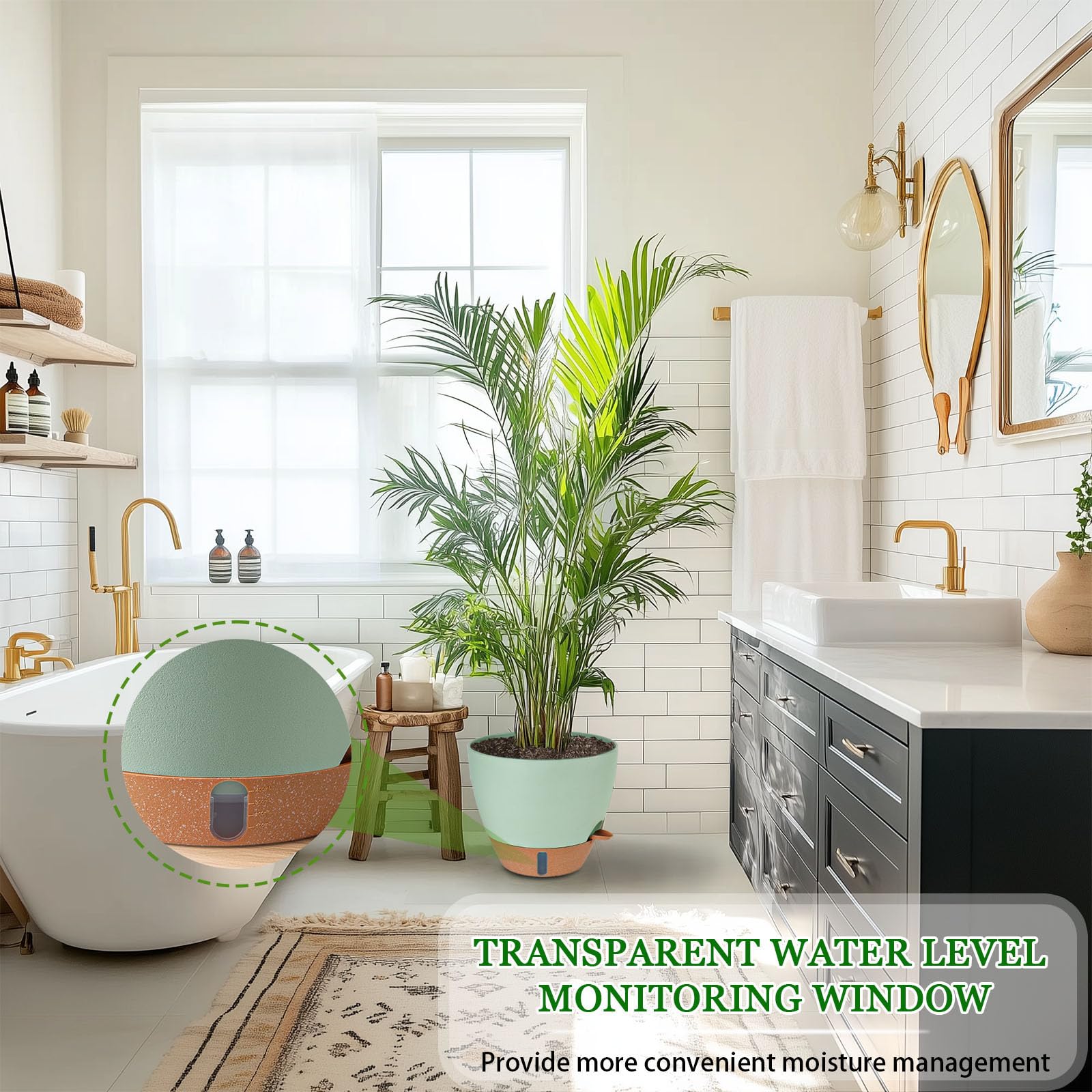 • 🌿 【Self-Watering Pots with Water Level Indicator】 Designed for busy plant lovers, our 8/10/12 self-watering pots feature a built-in ABSORBENT COTTON WICK SYSTEM that automatically draws water from the detachable bottom tray. The TRANSPARENT WATER LEVEL WINDOW WITH MEASUREMENT MARKINGS lets you monitor hydration at a glance, ensuring no overwatering or underwatering. Perfect for indoor/outdoor plants, this system keeps soil evenly moist for up to 7-10 days—ideal for vacations or hectic schedules.