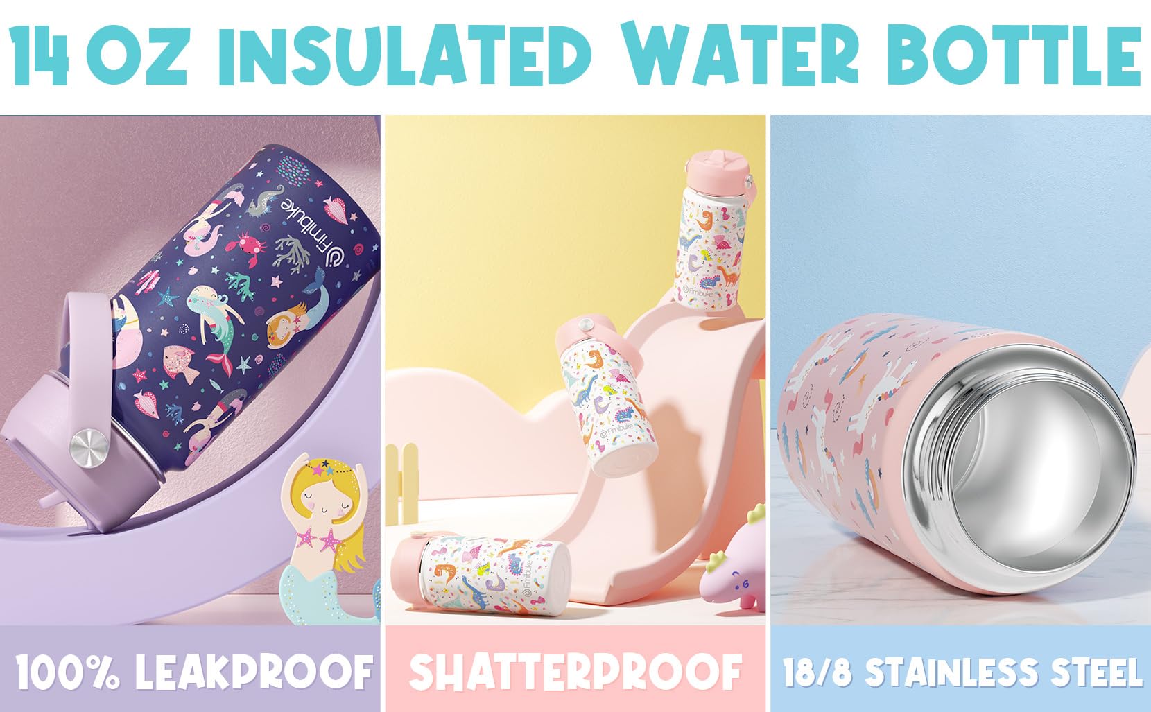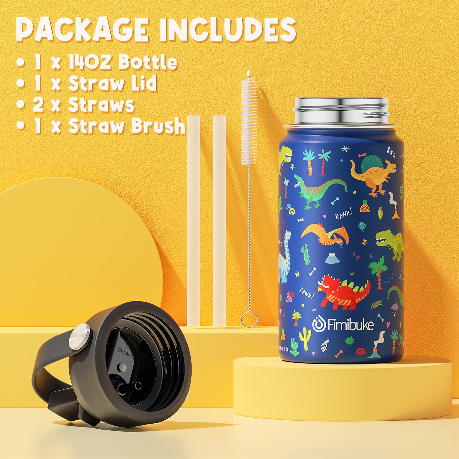 • 14OZ KIDS INSULATED WATER BOTTLE: With double-walled vacuum insulation, these toddler water bottle can preserve beverage temperature up to 24 hours for cold and 12 hours for hot. The seal zone technology in the lids guarantees that each insulated water bottle is 100% leak-proof and spill-proof. Fimibuke sweat-free kids water bottle features a sturdy wide rotating handle, allowing to carry kids drinks around to keep them hydrated without making messes. All designed to keep kids beverage fresh