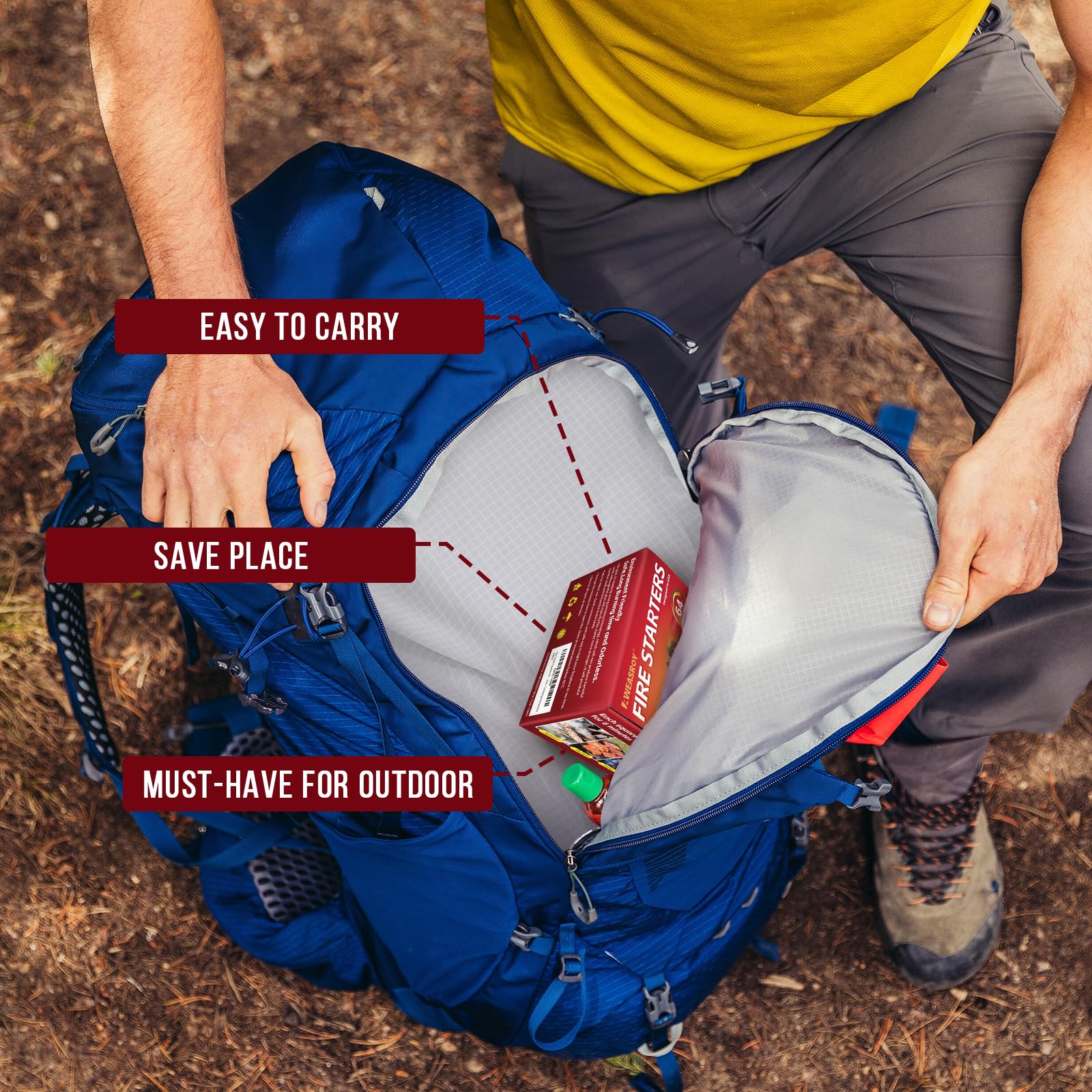 • GREAT VALUE: One pack of firestarter has 64 squares and is the universal choice as grill starter for BBQ, indoor fireplace, and outdoor camping. Just 1 or 2 fire starters to get your fire immediately. The fire starter for wood stove is compact and lightweight to place into your backpack with the portable size of camp fire starters, to light a campfire for camping and hunting trips