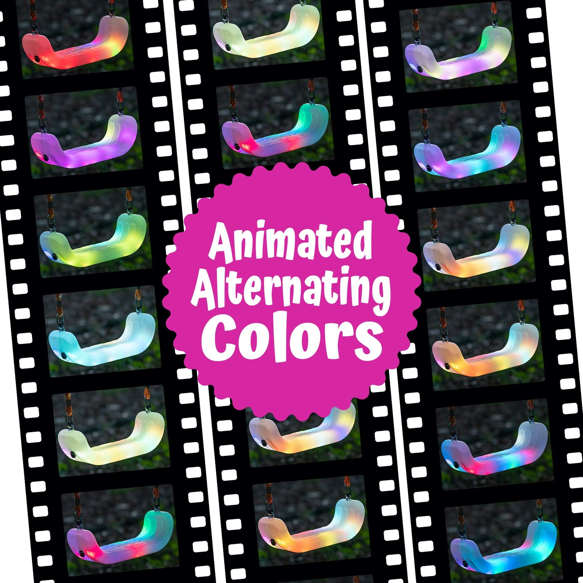 • Swing has 24 self-enclosed bright LED flashing strobing lights, 7 modes of operating light effects and 8 colors. The semi-clear swing allows the strobing colors to shine bright