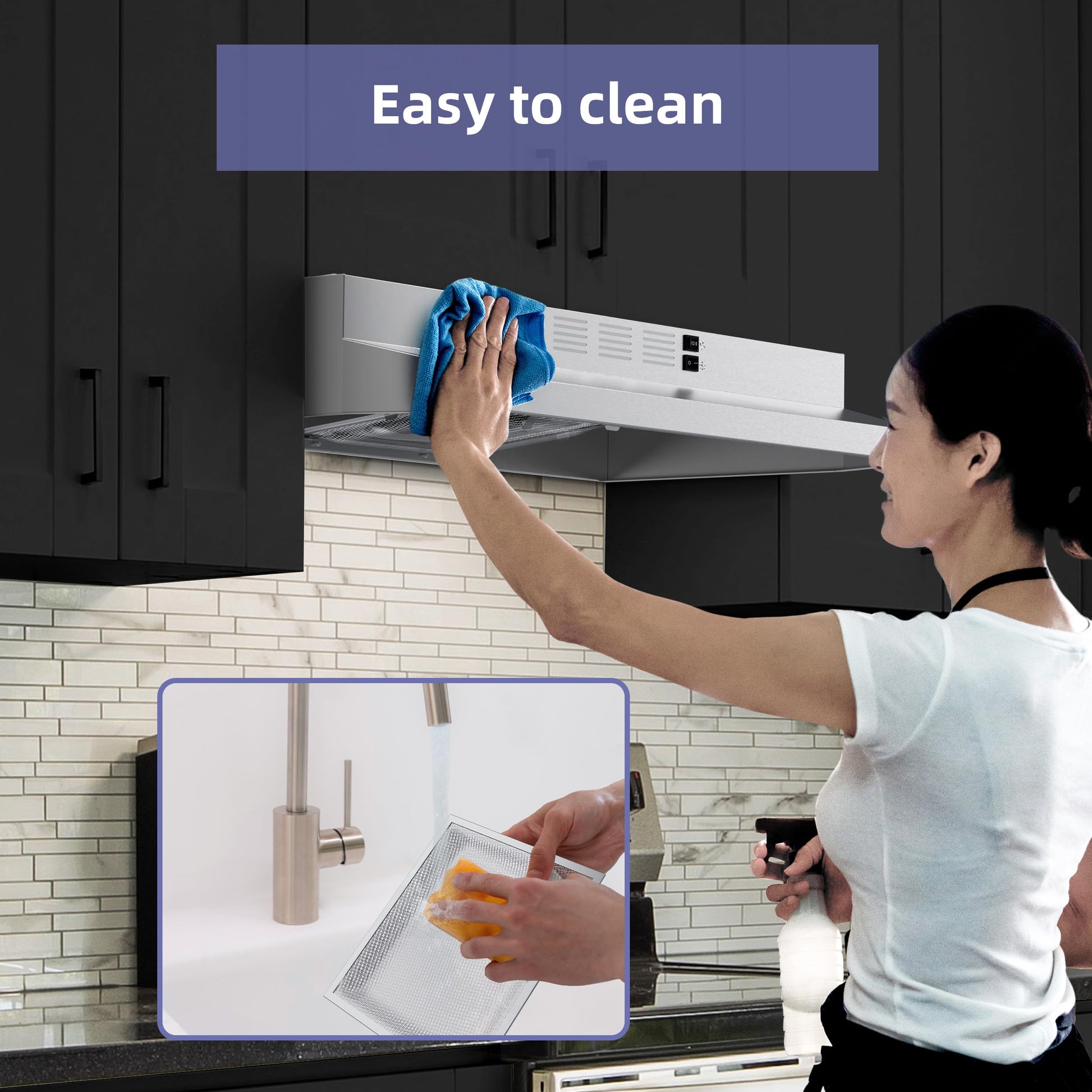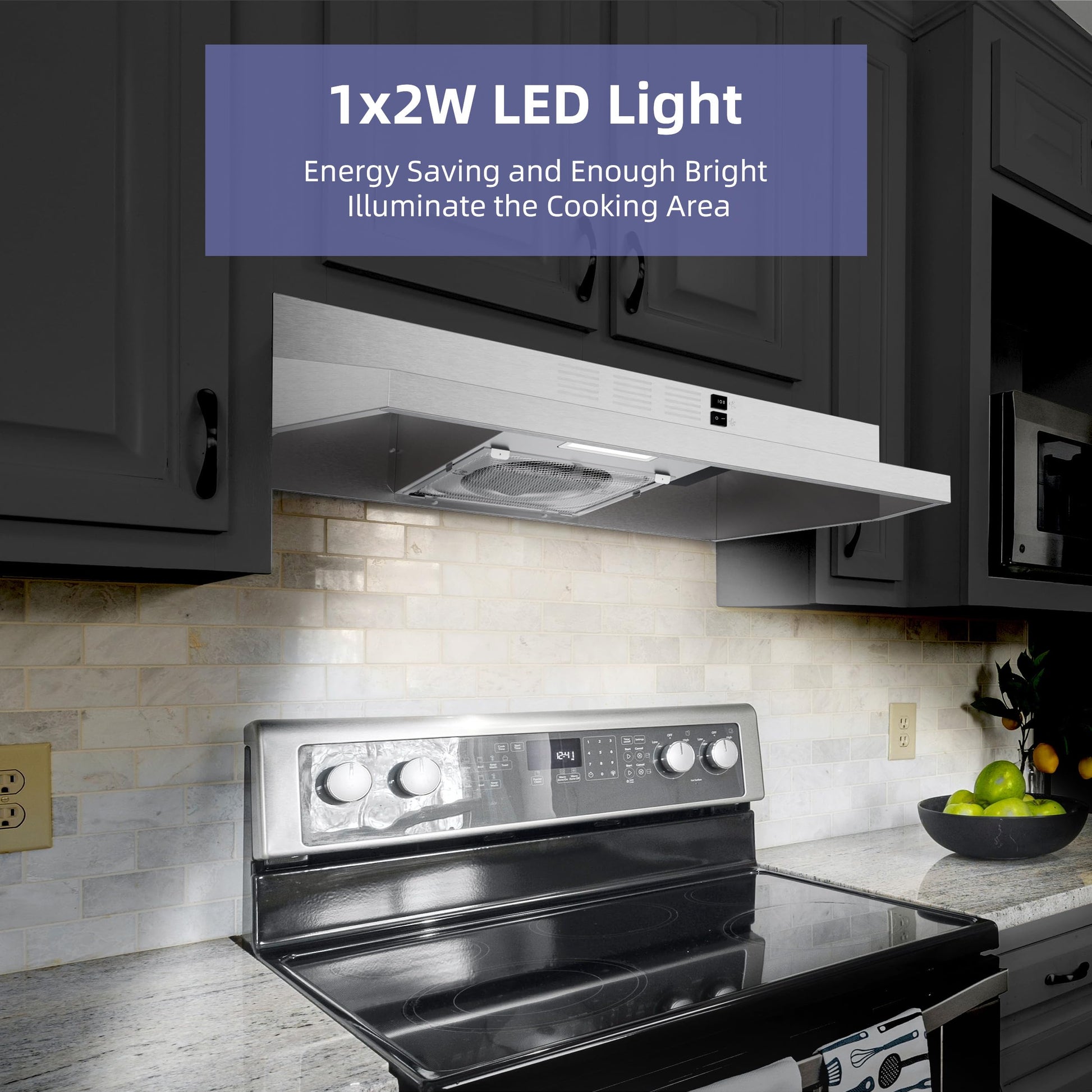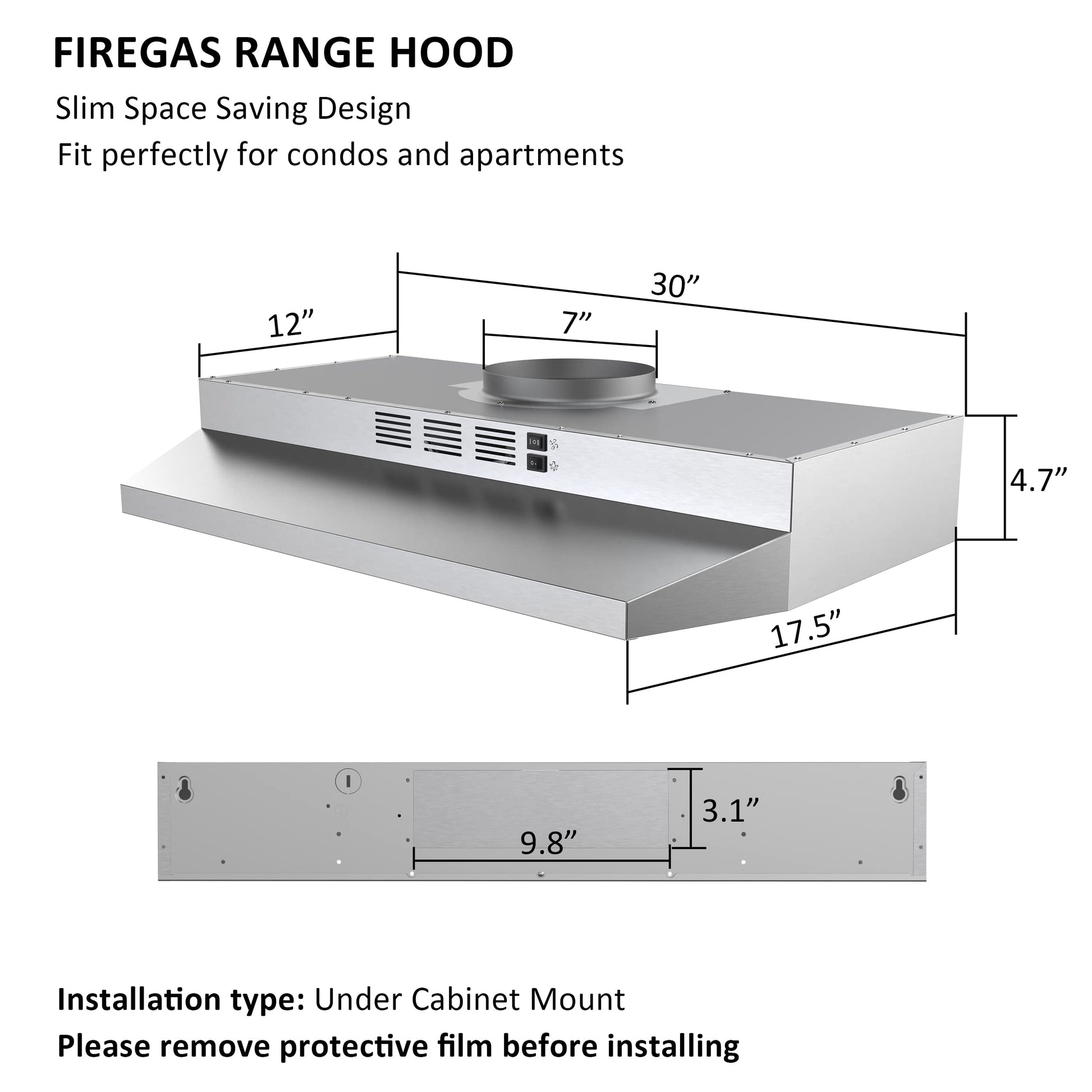 • WORK EFFICIENTLY RANGE HOOD: Under cabinet range hood 30 inch with 2-speed exhaust fan quickly remove greese and smoke in your kitchen,small profile are very suitable small kitchen about condos and apartment.This range hood is hard-wired without plug.