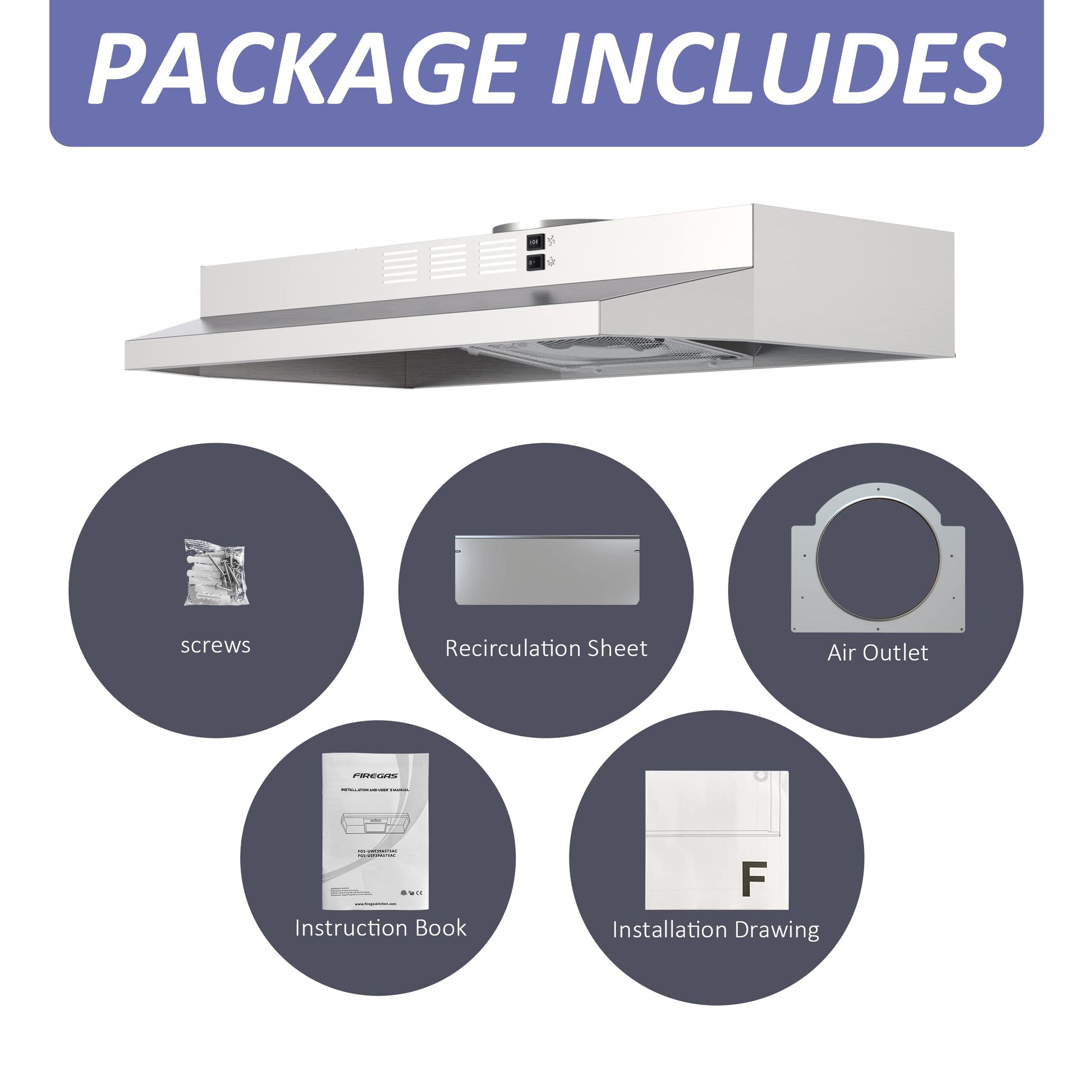• PACKAGE INCLUDES: Including a under cabinet range hood, recirculation sheet, air outlet, manual, installation instruction, multi-layer aluminum filter without charcoal filter and hard-wired without plug (plug sold separately, model: FGS-TF39-DYX).