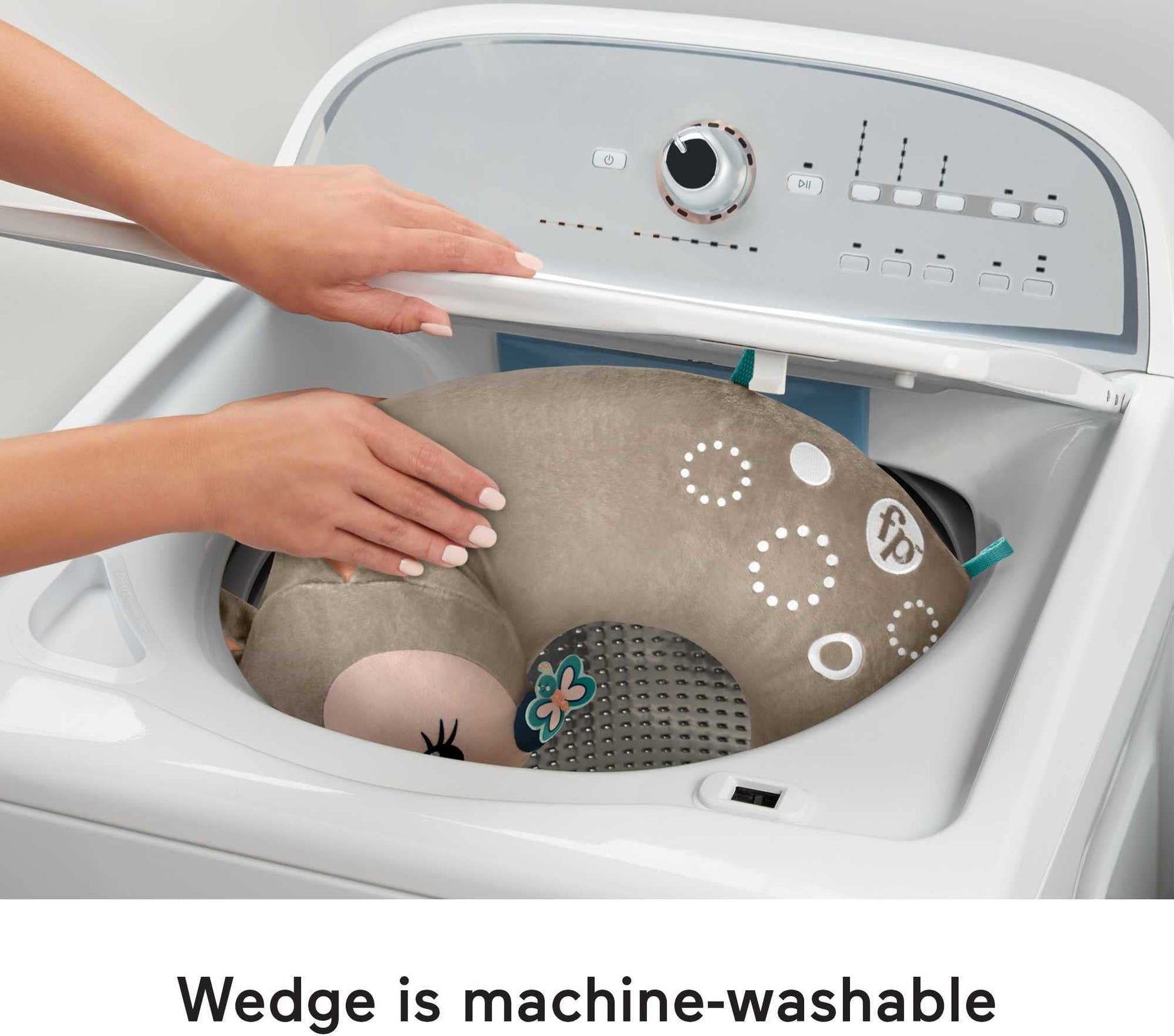 • Supportive and comfy fawn tummy time wedge with 3 developmental activity toys
