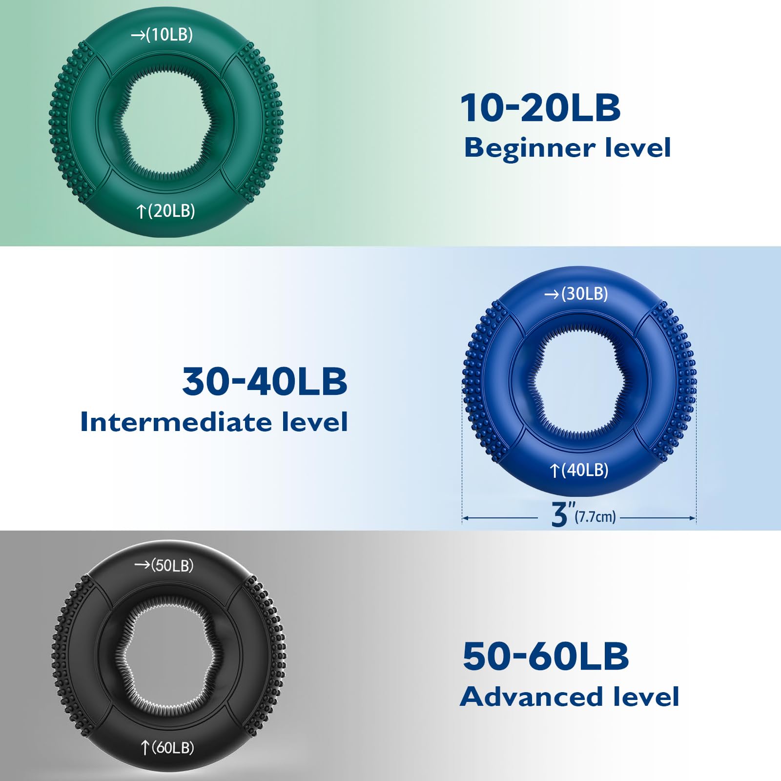 • ๐—Ÿ๐—ผ๐—ป๐—ด-๐—น๐—ฎ๐˜€๐˜๐—ถ๐—ป๐—ด & ๐—™๐—น๐—ฒ๐˜…๐—ถ๐—ฏ๐—น๐—ฒ ๐—š๐—ฟ๐—ถ๐—ฝ ๐—ฅ๐—ถ๐—ป๐—ด๐˜€: Advance your hand strength with our progressive hand gripper rings, offering adjustable resistance from a gentle 10-20LB to a tough 50-60LB. Each ring is made from premium food-grade silicone, ensuring lasting elasticity and shape retention. The non-slip textured surface provides a secure and comfortable grip.