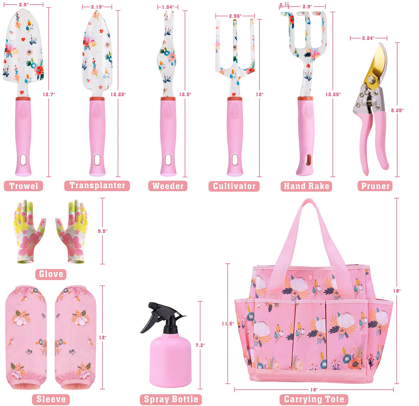 Floral Garden Tools Set,Heavy Duty Gardening Tools for Gardener,Gardening Gifts for Women,Storage Tote Bag,Sleeves,Gloves,Trowel,Transplanter,Rake,Weeder,Cultivator,Pruner,Succulent Hand Tools,Pink