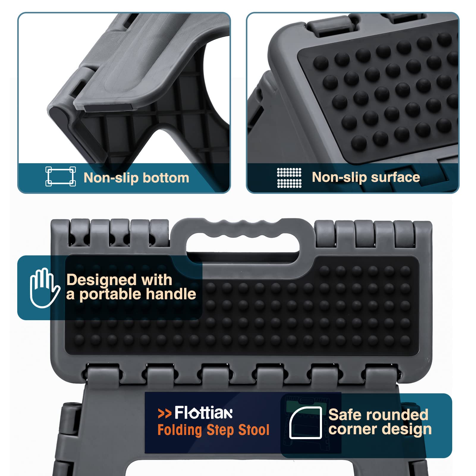 Flottian 16" Folding Step Stool for Adults and Kids Holds Up to 300 lbs,Non-Slip Folding Stools with Handle, Compact Plastic Foldable Step Stool for Bathroom,Bedroom, Kitchen, Gray,1PC
