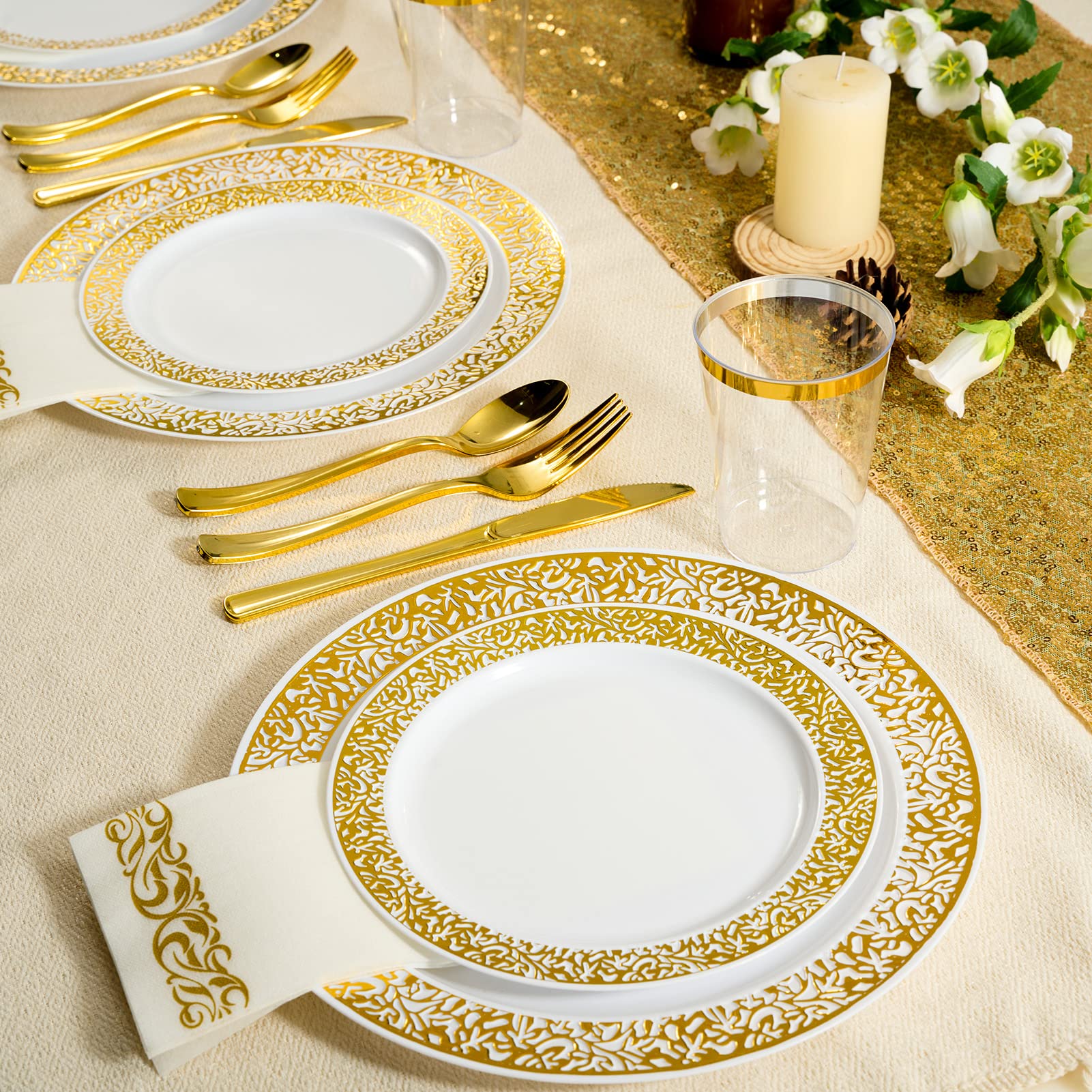 FOCUSLINE 175 Ct Gold Dinnerware Set for 25 Guests, White Plastic Plates with Gold Lace Rim Design, Including 25 Disposable Dinner & Dessert Plates, Cups, Napkins, Cutlery Set
