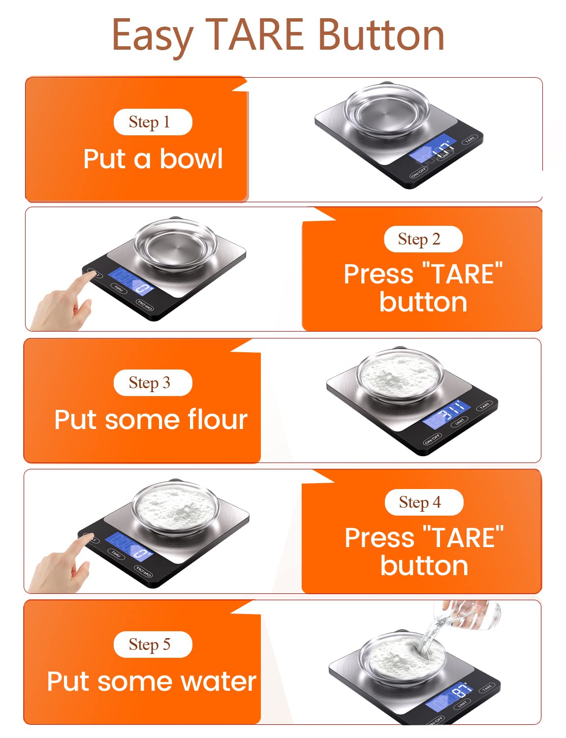 • 【Weight Control Scale -Easy Tare】 The Tare button allows you to subtract the weight of mug, plate, or different sized bowl, making it easy to achieve accurate readouts of nuts, grains, powder, fruit, milk and more food.