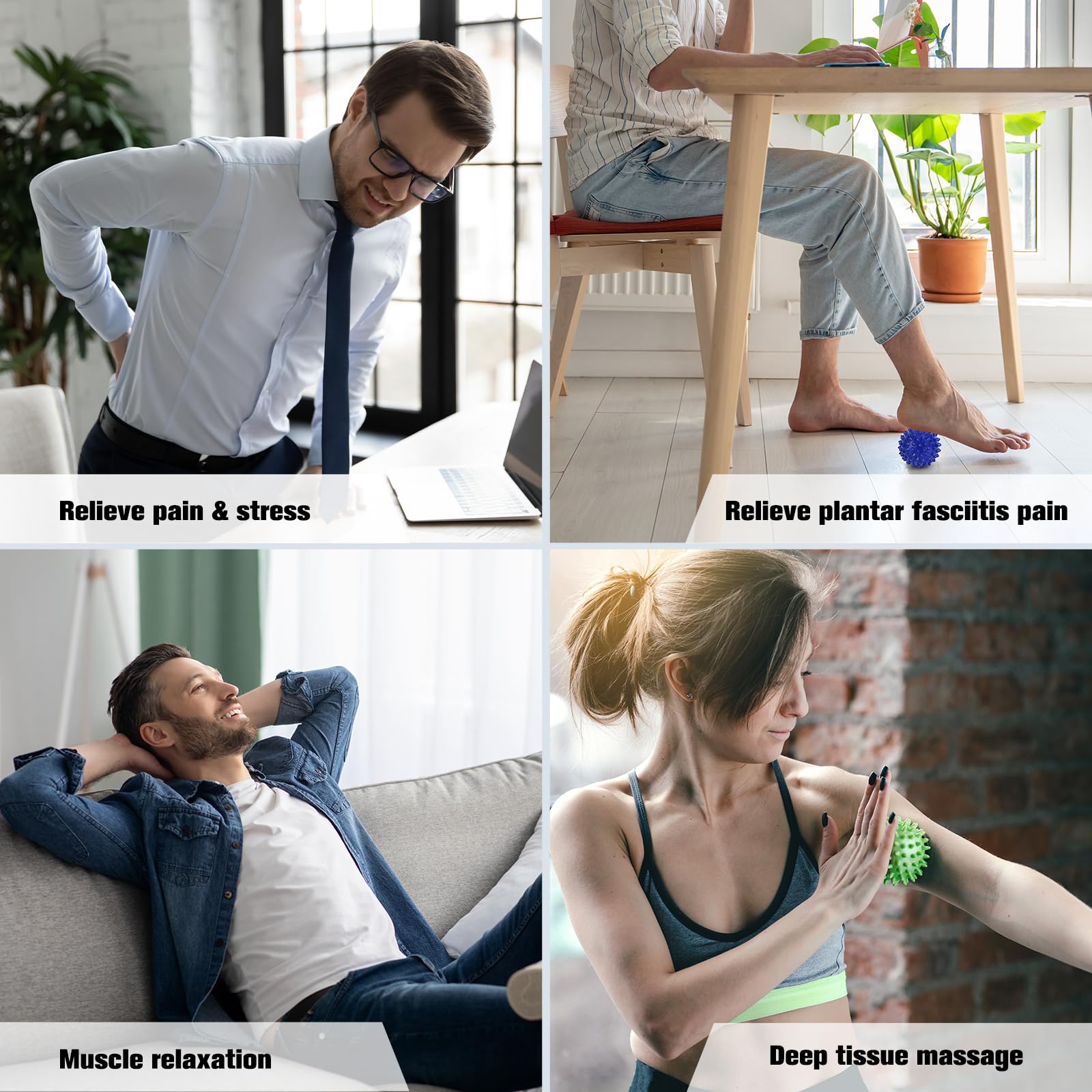 • Foot Massager for Plantar Fasciitis Relief: The plantar fasciitis ball massager and roller applies acupressure for pressuring on feet to deep tissue massage, decrease tension, and improve blood circulation. It is perfect for plantar fasciitis, acupoint, tired feet pain, aches, heel spurs. Also, they effect to hands, forearms, shoulders, back, feet, hamstrings etc