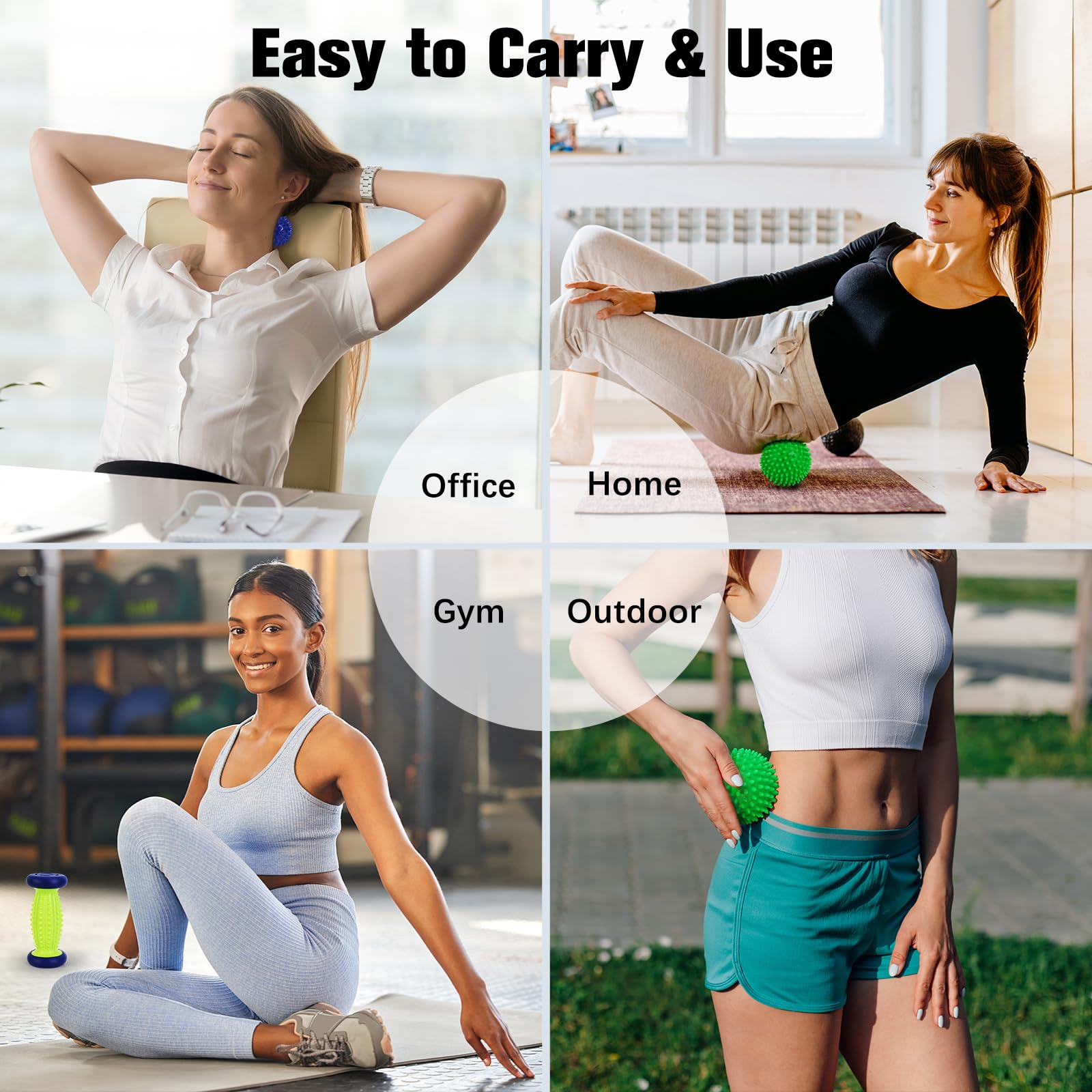 • Portable Foot Ball Roller Massager: Foot massage balls and roller are compact in size. With a drawstring bag for convenient storage and is easily carried around. They are lightweight and do not take up much space, you can take them to many places such as gym, park, office, hotel, home etc