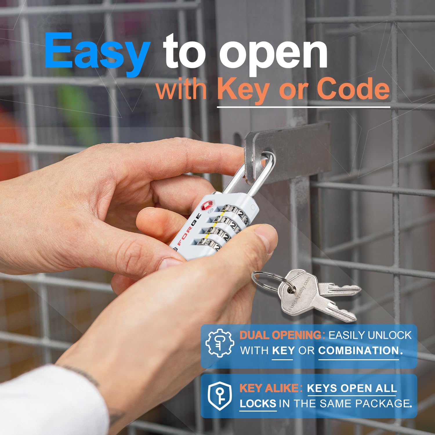 Forge Dual-Opening: Key or Combination Access Lock, TSA Approved Locks for Luggage, Pelican case, Travel, Gym, School, Stainless Steel Shackle. (Multi Color, 4 Pk)