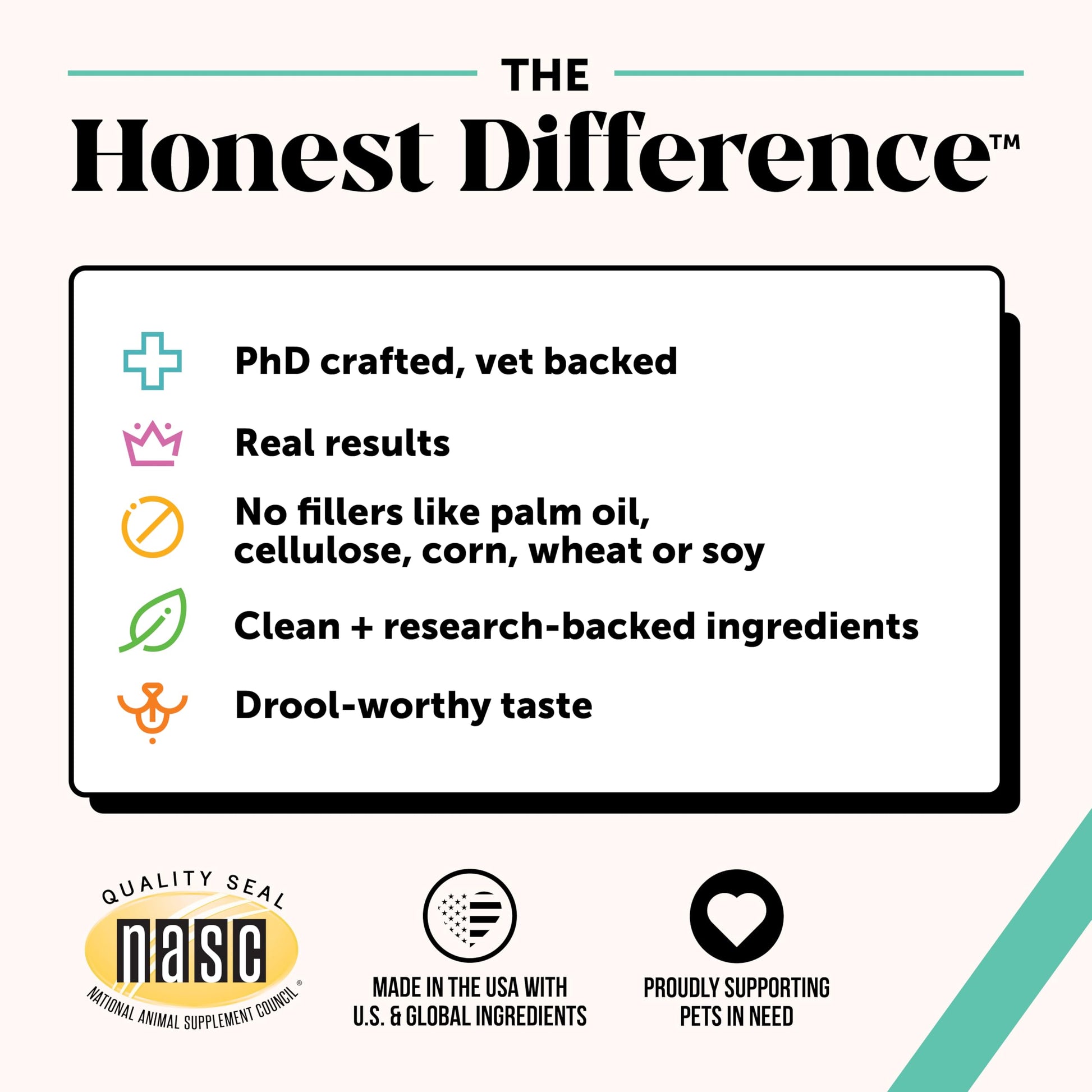 • MANUFACTURED IN THE U.S.A. | NASC MEMBER COMPANY: All Pet Honesty products are made in the US with US and globally sourced ingredients and as a NASC member company, we meet the highest quality & compliance standards for pet supplements. Plus, we support pets in need nationwide through our award-winning Social Impact Committee. Because we believe honesty goes beyond a supplement.
