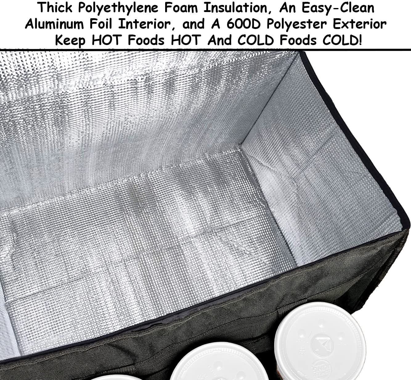 • βœ… π—ͺ𝗔π—₯𝗠 𝗔𝗑𝗗 π—–π—’π—Ÿπ—— π—œπ—‘π—¦π—¨π—Ÿπ—”π—§π—œπ—’π—‘ - Polyethylene foam + aluminum foil interior ensures amazing insulation for your food and drink. This is a great food warmer or cooler that you can keep in your car. Keep your food fresh during all your deliveries with warm and cold insulation!