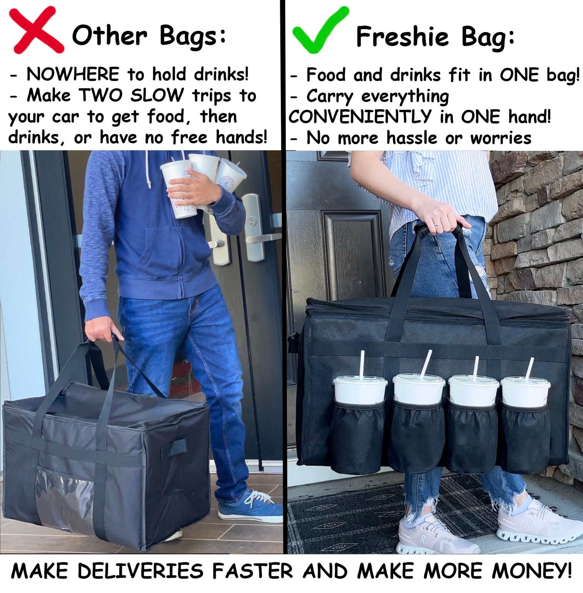 FRESHIE Insulated Food Delivery Bag with Cup Holders/Drink Carriers Premium, for Doordash, Uber Eats, Grubhub, Pizza Bag, Catering, Beverage, Commercial Quality (XL Pro)