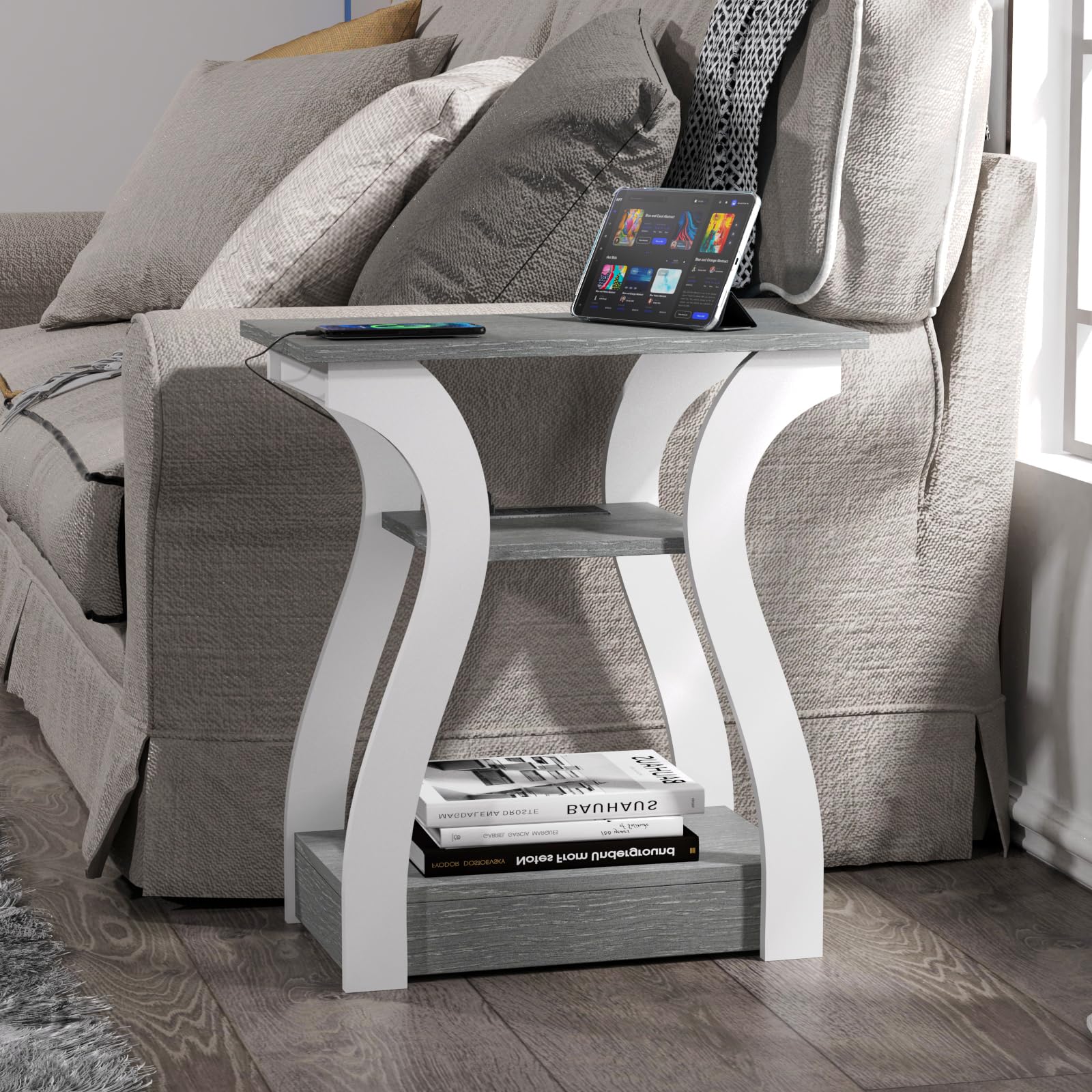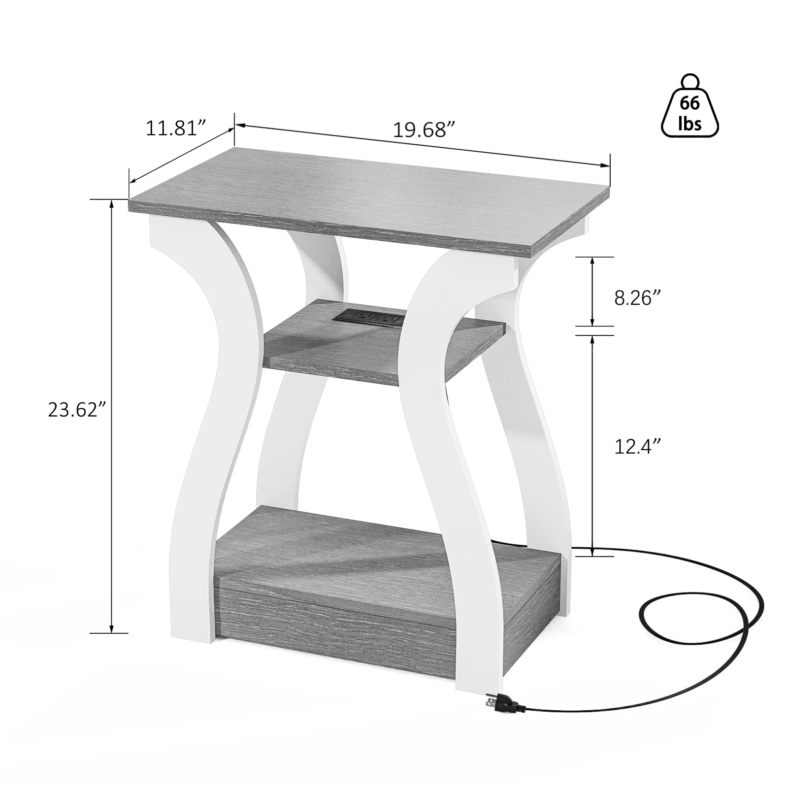 FROMJBEST End Tables Living Room, Grey End Table with Charging Station, Grey Side Table, Nightstand for Bedroom, 3 Tier End Table with Storage Shelf for Living Room
