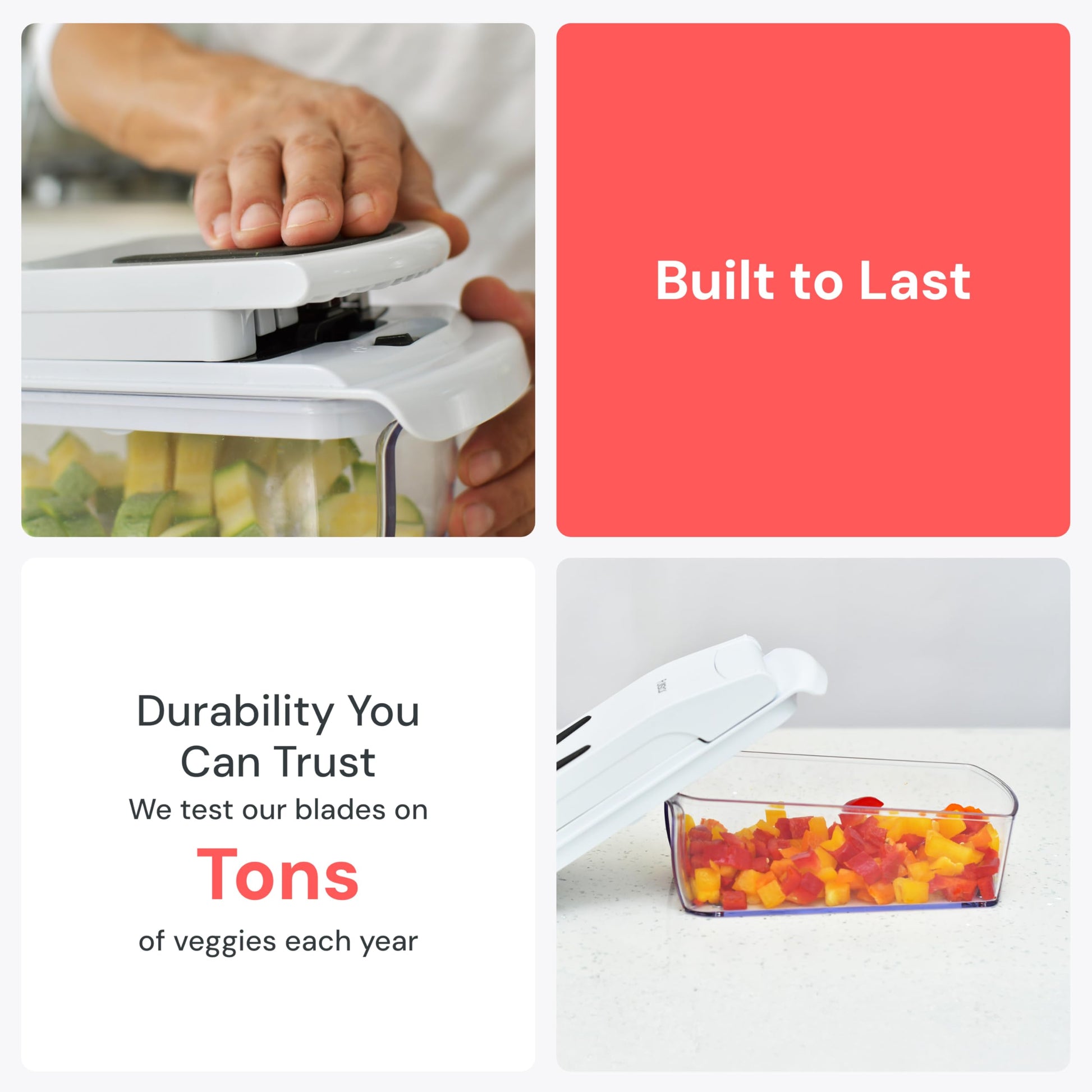 • 5-Star Design – The soft-grip TPU handle ensures controlled chopping, while the non-skid rubber base keeps the BPA-free veggie chopper steady on any surface, wet or dry. The built-in catch tray keeps counters clean and mess-free.