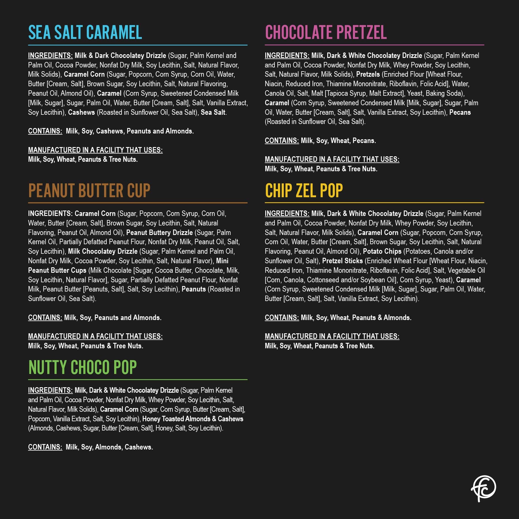 • (1) SEA SALT CARAMEL starts with gooey caramel, the perfect amount of sea salt, roasted cashews and a drizzle of milk and dark chocolatey goodness. (2) PEANUT BUTTER CUP popcorn is the fan fav. Tiny chocolate peanut butter cups are mixed with caramel popcorn and drizzled in caramel plus white, milk and dark chocolate. (3) NUTTY CHOCO POP is a sweet mix of white, milk and dark chocolate drizzled on caramel popcorn then joined with almonds and cashews
