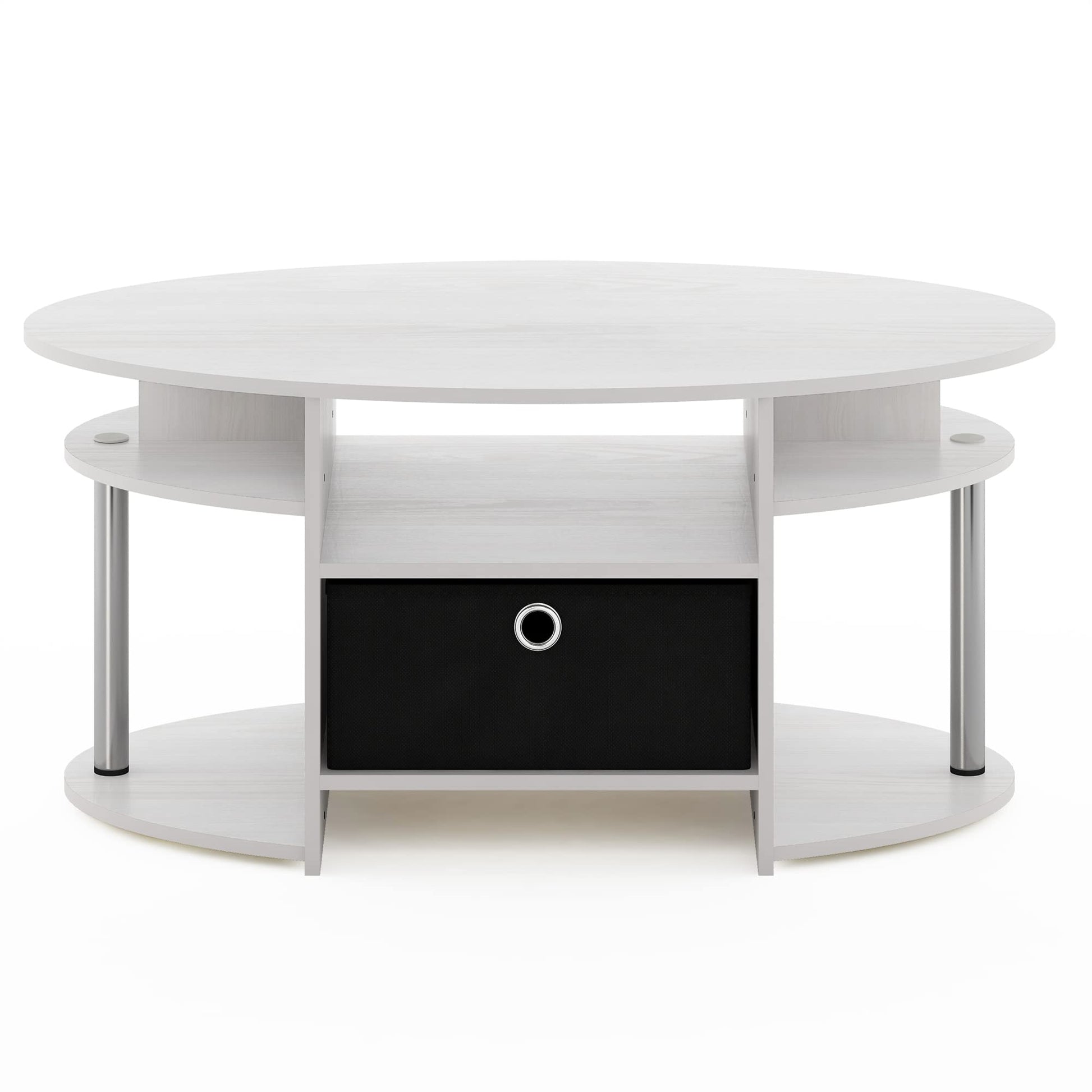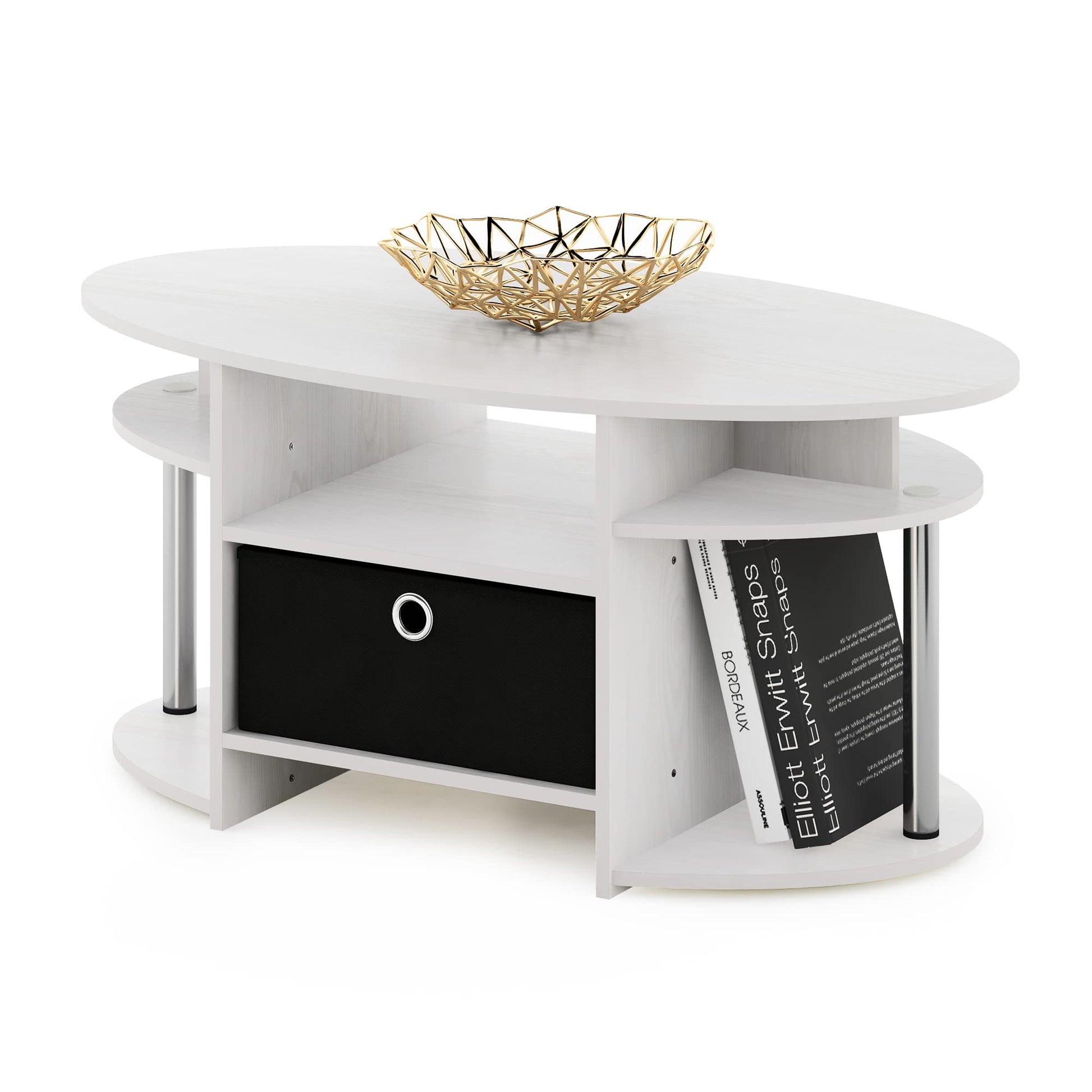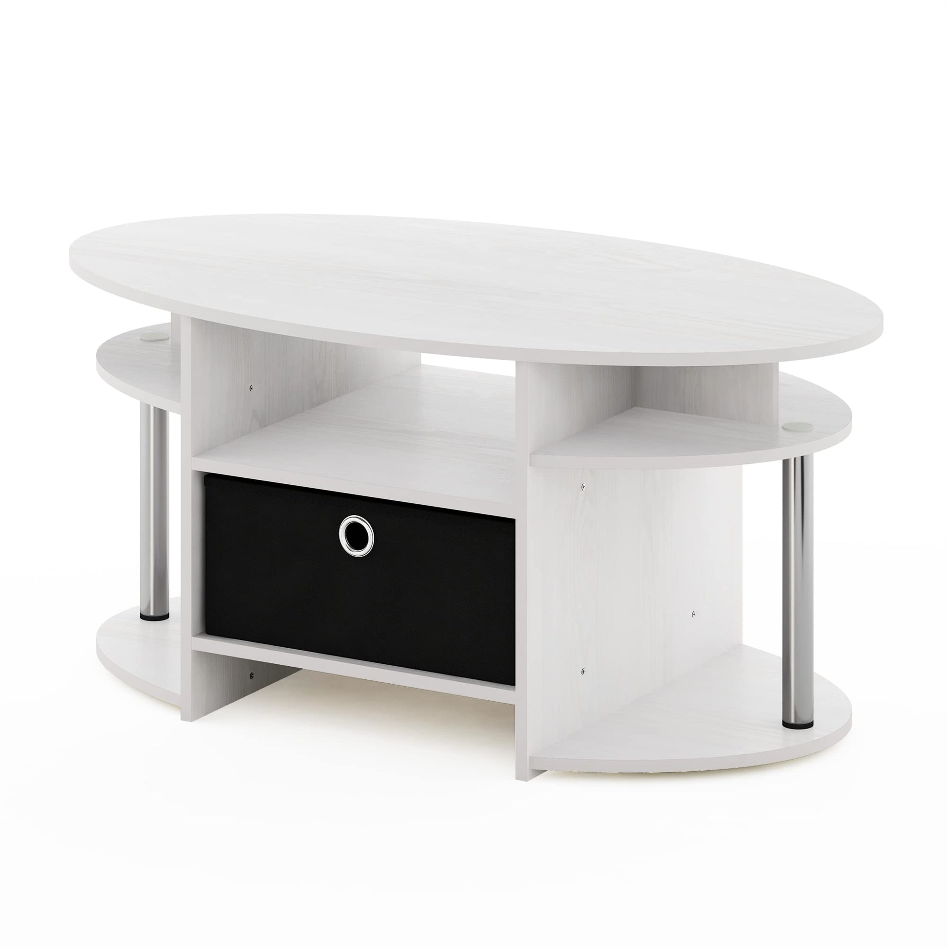 Furinno Jaya Simple Design Oval Coffee Table with Bin for Living Room, White Oak/Chrome/Black