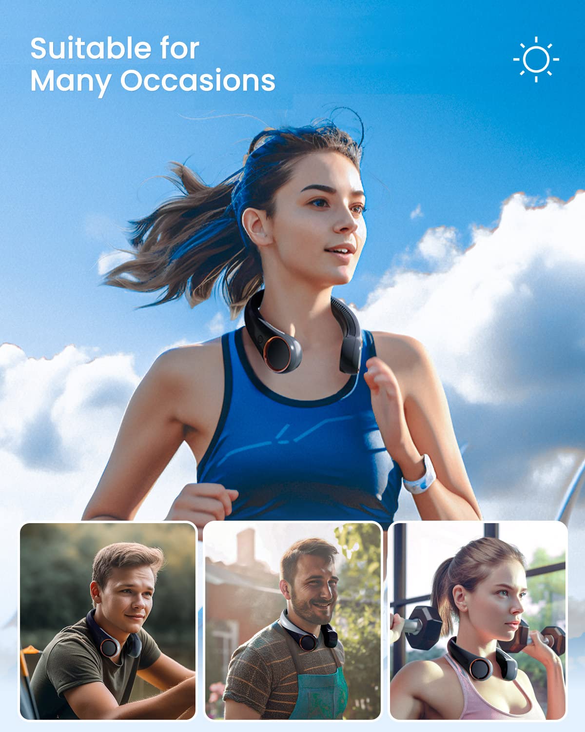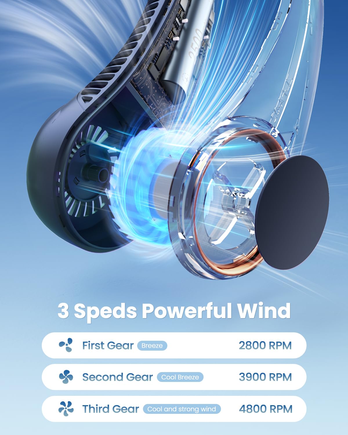 • Powerful Wind with 3 Speed Settings: This neck cooler uses turbine blades to boost airflow, delivering steady, strong wind that quickly refreshes you. You can easily adjust the speed to suit your needs—whether you want a gentle breeze or a powerful blast