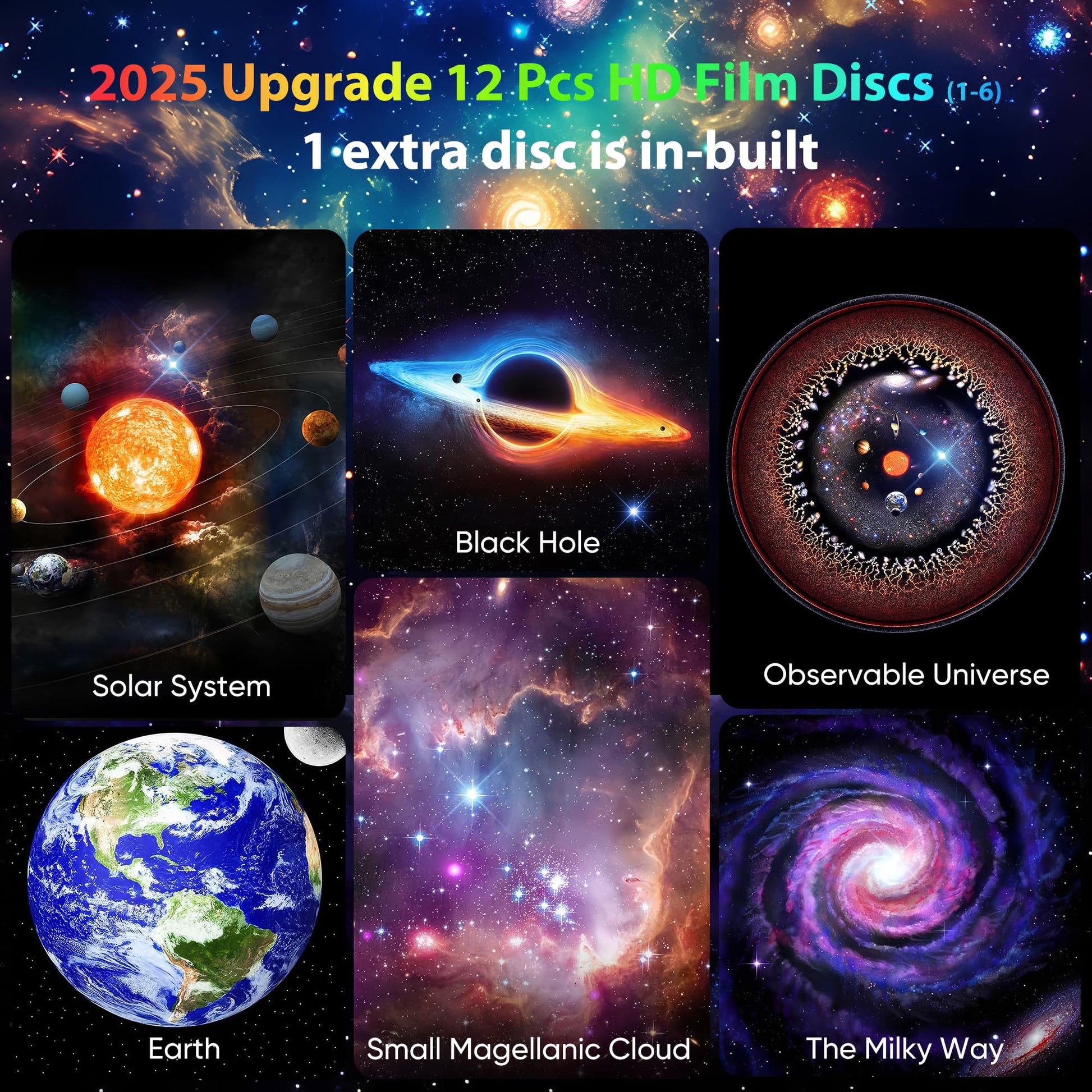 • 【Pro Version 12 in 1 Planetarium Projector】: Please pull the tray handle to replace the slide to switch the galaxy pattern. Transform your room into 13 stunning universe spectacles using film discs. The pattern names are 1: Earth, 2: The Milky Way, 3: Black Hole, 4: Observable Universe 5: Solar System, 6: Small Magellanic Cloud, 7: Valentine's Day, 8: Local Group, 9: Virgo Supercluster, 10: Laniakea Supercluster, 11: Wormhole and 12: Mystic Mountain. 13: Moon (in-built).