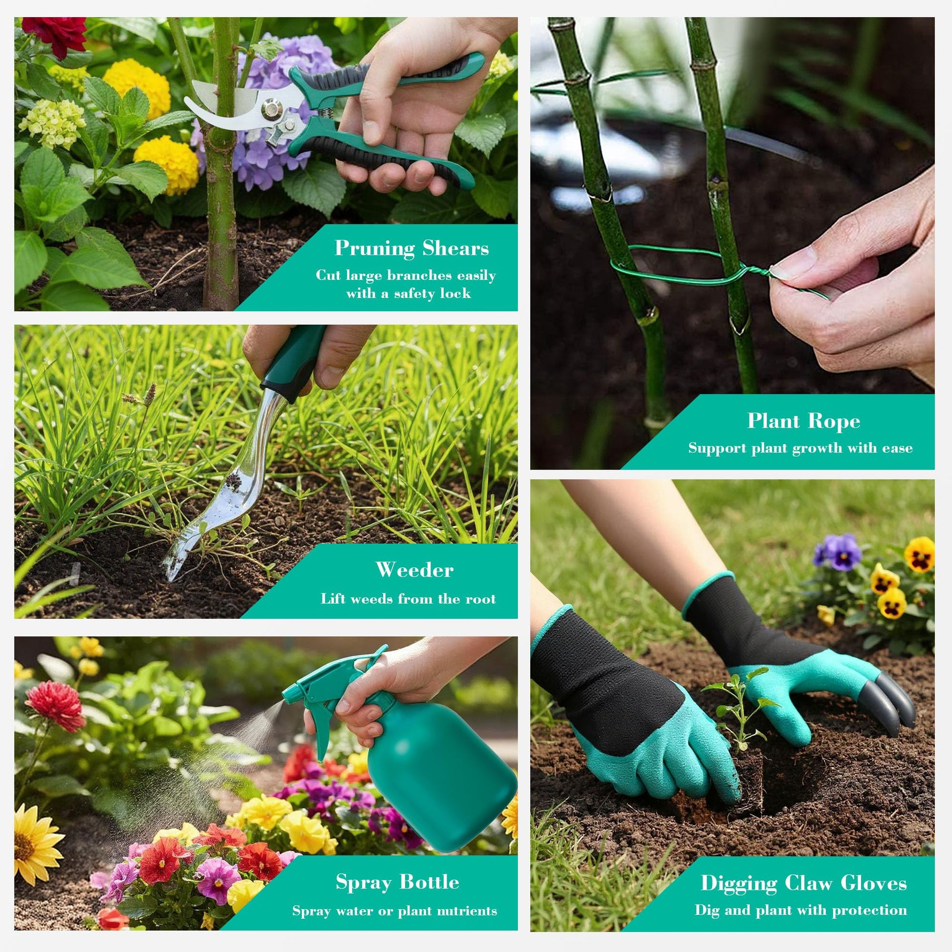 • 11-PIECE ALL-IN-ONE — Large trowel, transplanter, hand rake, cultivator, weeder, pruning shears, pruning snips, 100-ft rope, handheld sprayer, claw gloves, and an Oxford tote—everything to prune, dig, weed, aerate, and plant. Covers your gardening essentials and everyday gardening tools needs in one gardening tool set.