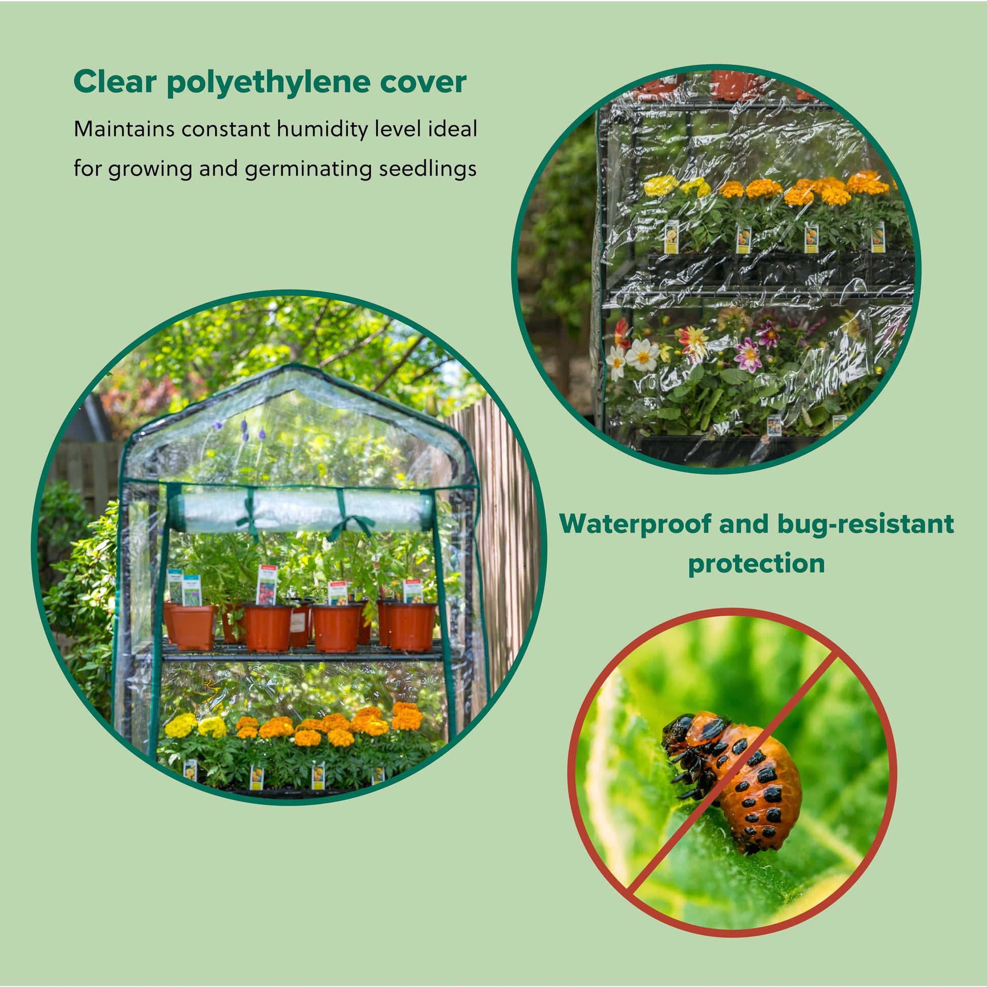 Details: The Gardman R687 4-Tier Mini Greenhouse is ideal for small backyards, decks, courtyards, and balconies, to provide protection from weather conditions. The Greenhouse is a perfect foundation for your seedlings and young plants to thrive, shielding the vegetation and therefore extending the plant growing season. The Gardman greenhouse is lightweight, yet sturdy, made of high quality solid powder-coated tubular steel and a heavy-duty clear polyethylene cover that will last seasons. The roll-up zippered door provides easy access with humidity control by simply opening/closing the zippered front flap. The assembly instructions are easy to follow and require no tools. The Greenhouse includes four 18" deep shelves with simple push-fit assembly, guy ropes, and metal stakes for extra stability against wind. For additional security, a zip tie can be attached from the frame to the shelves and there are tabs on the back to fasten it to a wall or patio railing. Enrich your Greenhouse by adding a combination of grow lights, thermometer/hygrometer, heating mats, fans, etc. The dimensions are 27" Long x 18" Wide x 63" High. **Replacement cover (sold separately) for this greenhouse is Gardman item #R687SC. Gardman "Bring your garden to life" “WARNING: This product can expose you to chemicals including Di(2-ethylhexyl)phthalate (DEHP), which is known to the State of California to cause cancer. For more information, go to www.P65Warnings.ca.gov.”
