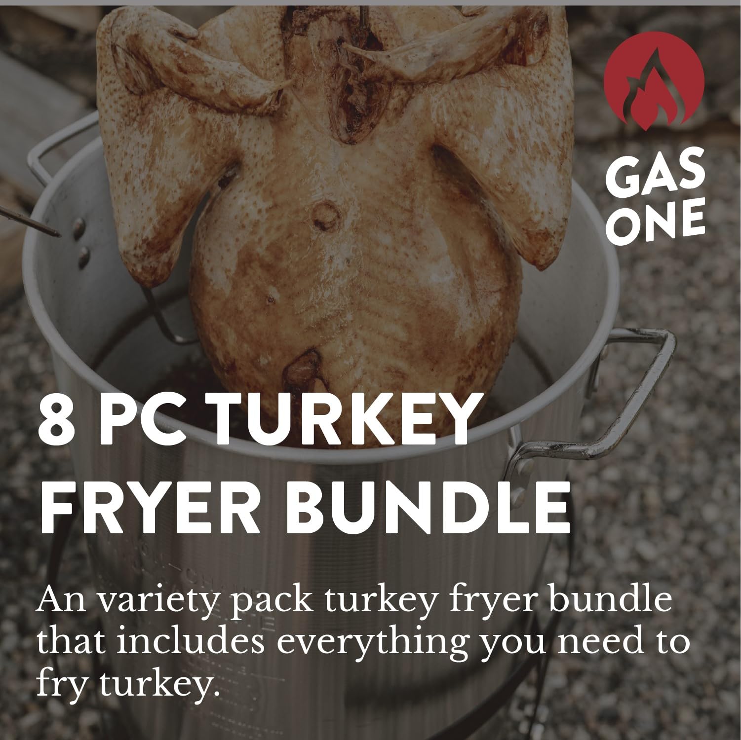 The Complete Turkey Fryer Set: The B-5155-RED deep fryer for home use includes everything you need for a reliable, safe and highly rewarding deep frying experience. The 7 in 1 set comes with: propane cooker, regulator and hose kit, large stockpot with Perforated Basket, thermometer, marinade injector and turkey rack.